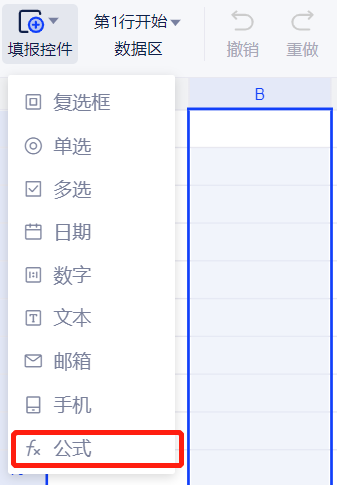 • 当填报控件为公式时,设置入库字段,即可进行函数编辑