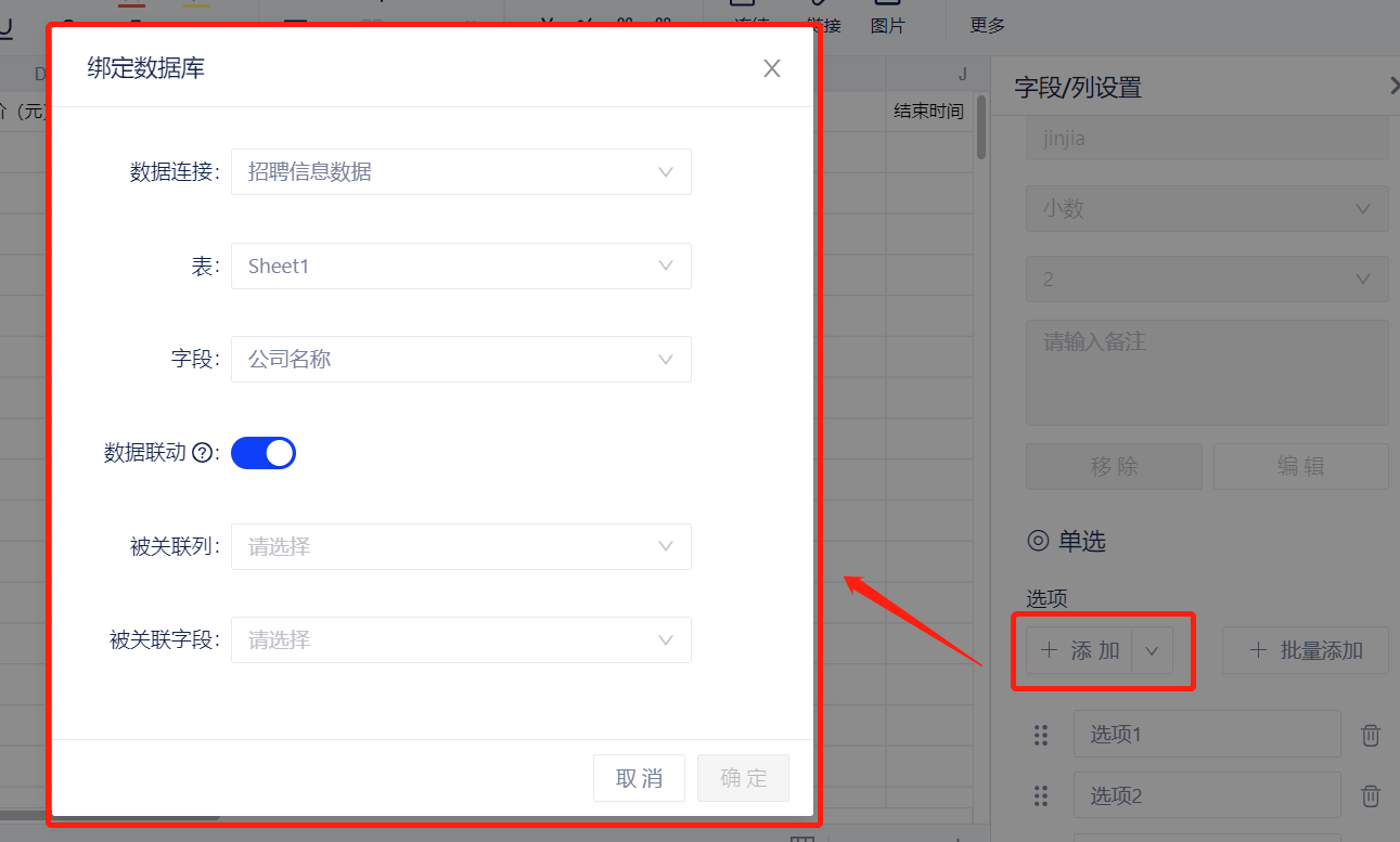 • 当填报控件为单选/多选时,选项配置可以与数据表中的字段联动,在选项中选择需绑定的数据库,即可进行配置