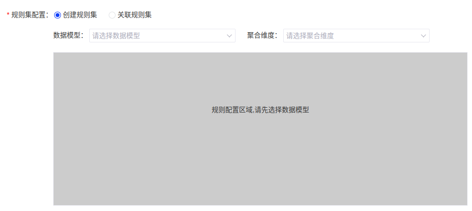 (3)规则集配置中,【创建规则集】需先选择数据模型,在选择对应的聚合维度,同时可在下方规则配置区进行维度字段的配置,进一步筛选;