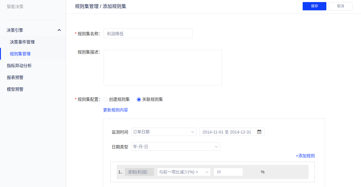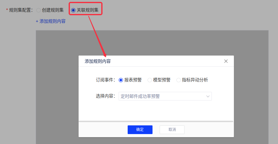 (4)规则集配置中,【关联规则集】可关联已经创建的度量预警或指标移动分析的规则,规则来源包括:报表预警、模型预警、指标异动分析;