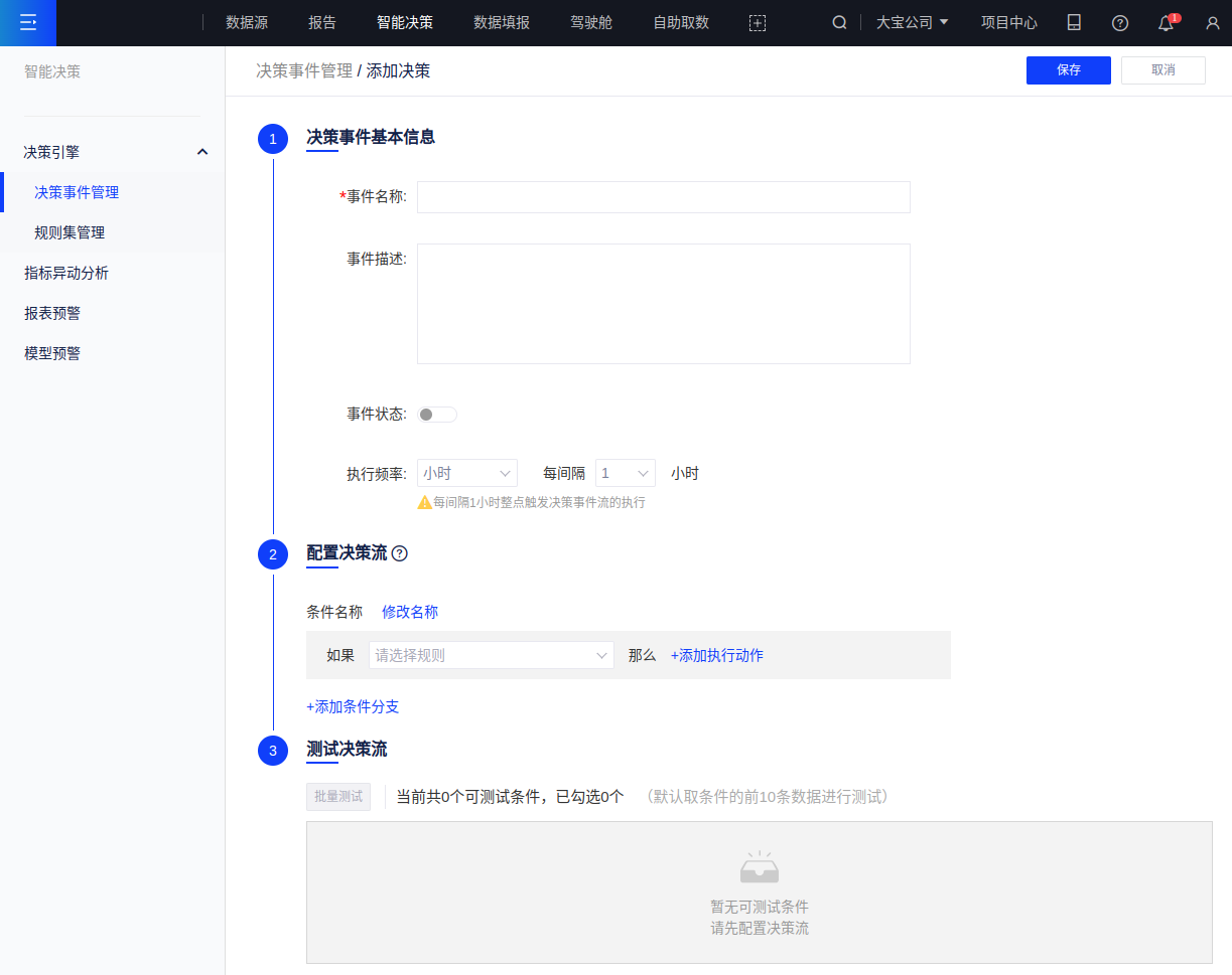 (1)决策事件管理列表支持添加决策事件,点击[添加]进入配置页面;
