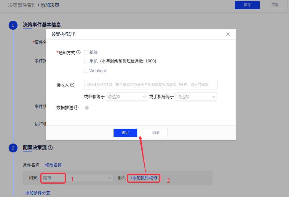 (1)在决策事件管理列表添加一条决策事件,然后依次设置事件名称、描述、状态、执行频率和配置决策流,在配置决策流环节点击【添加执行动作】;
