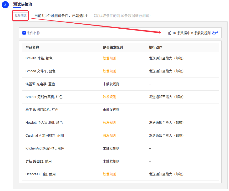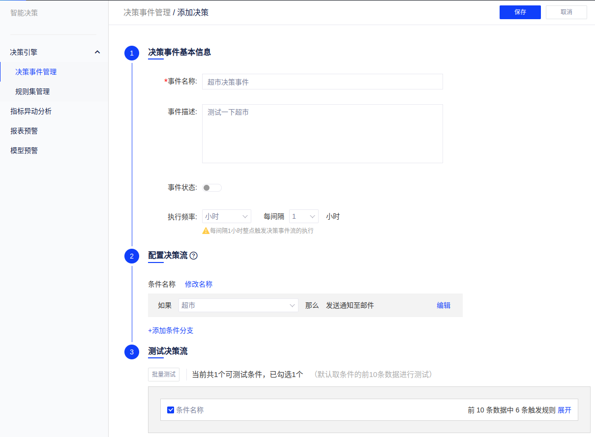 操作案例:想查看东北地区超市产品信息,上一环节中创建了一个规则集,在决策事件管理中,首先填写决策事件的基本信息,配置决策流中,在条件分支中选择创建的超市规则,选择通知方式及接收人,可以在下方选择测试该规则。具体操作如下: