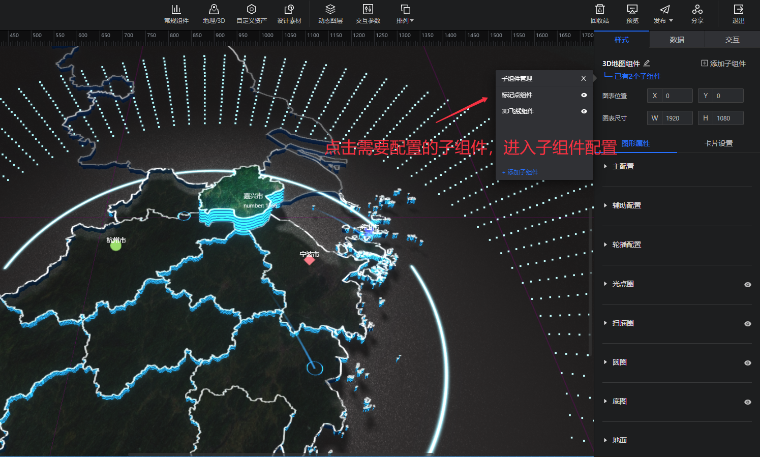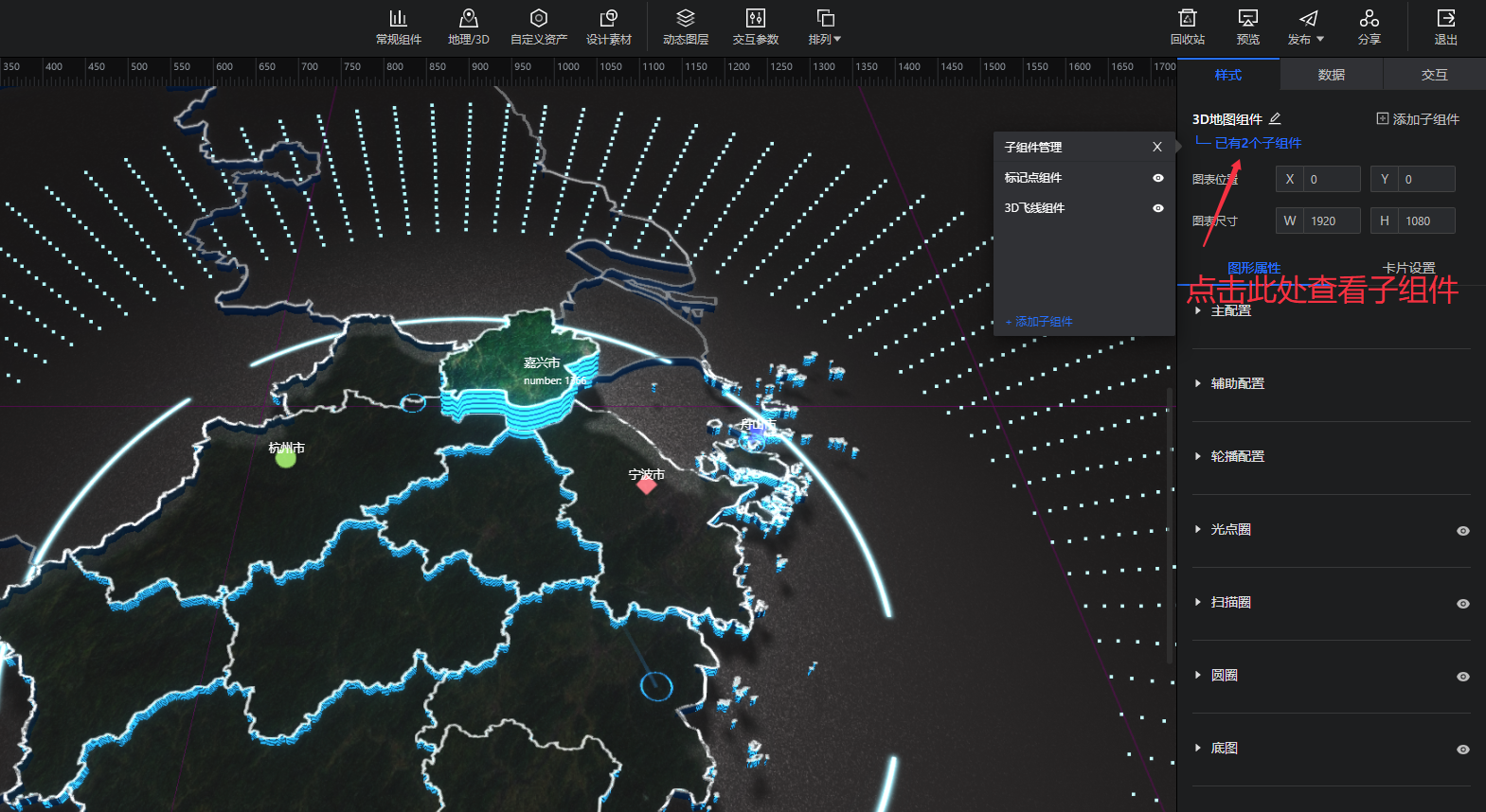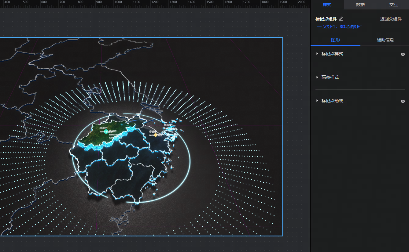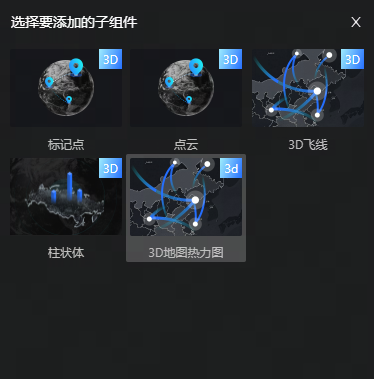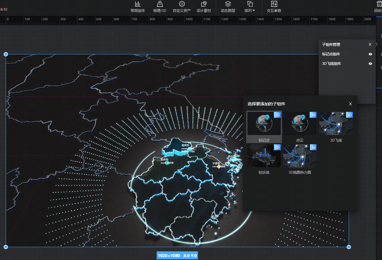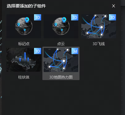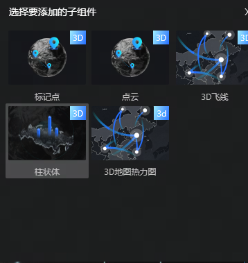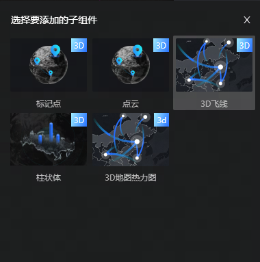 3D地图目前支持标记点、飞线、柱状体等子组件。
