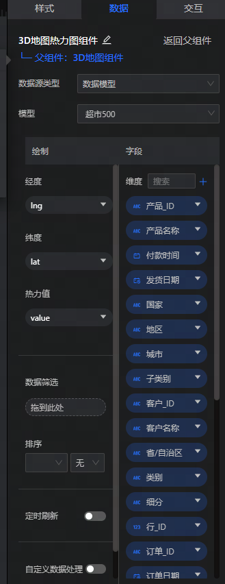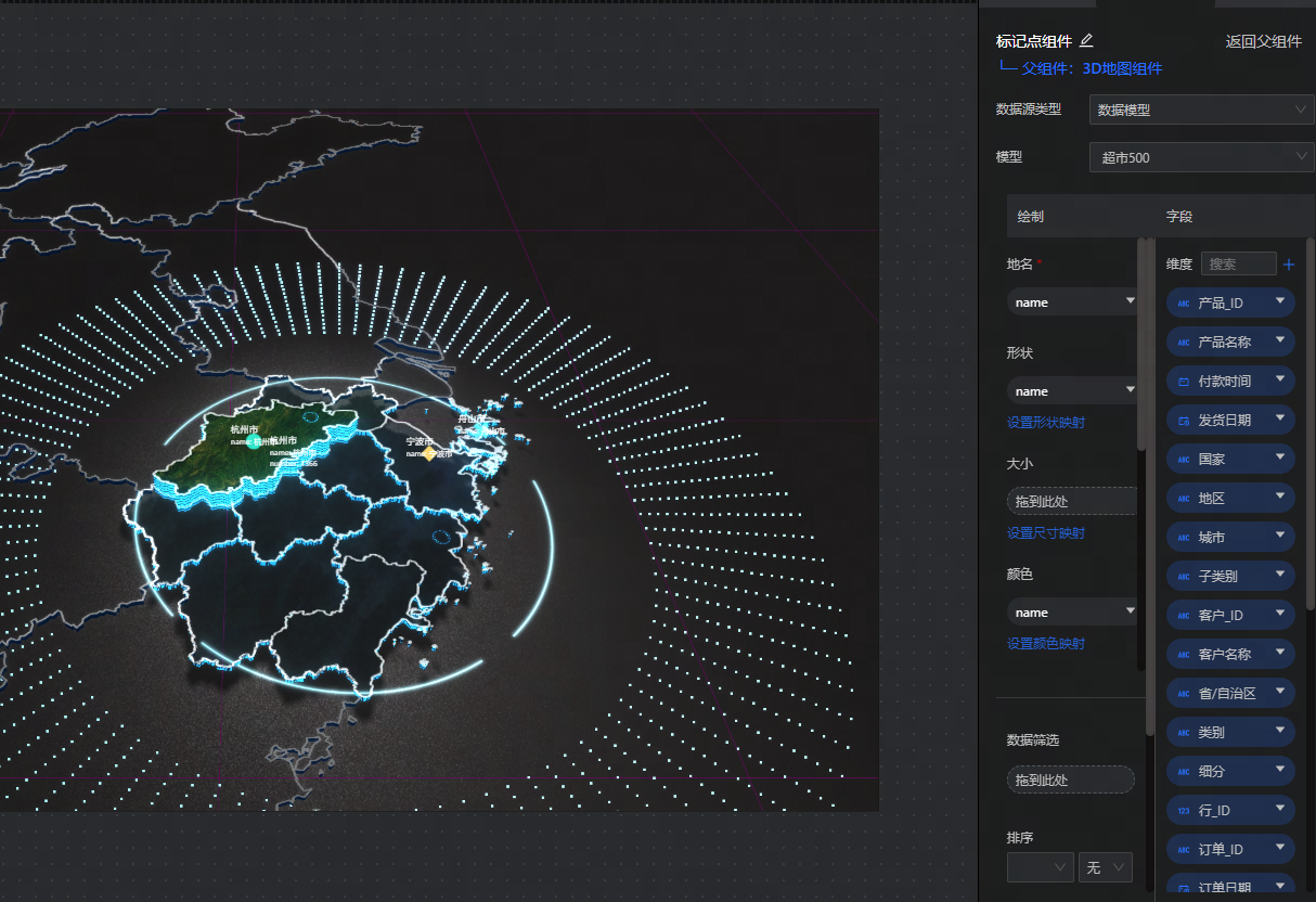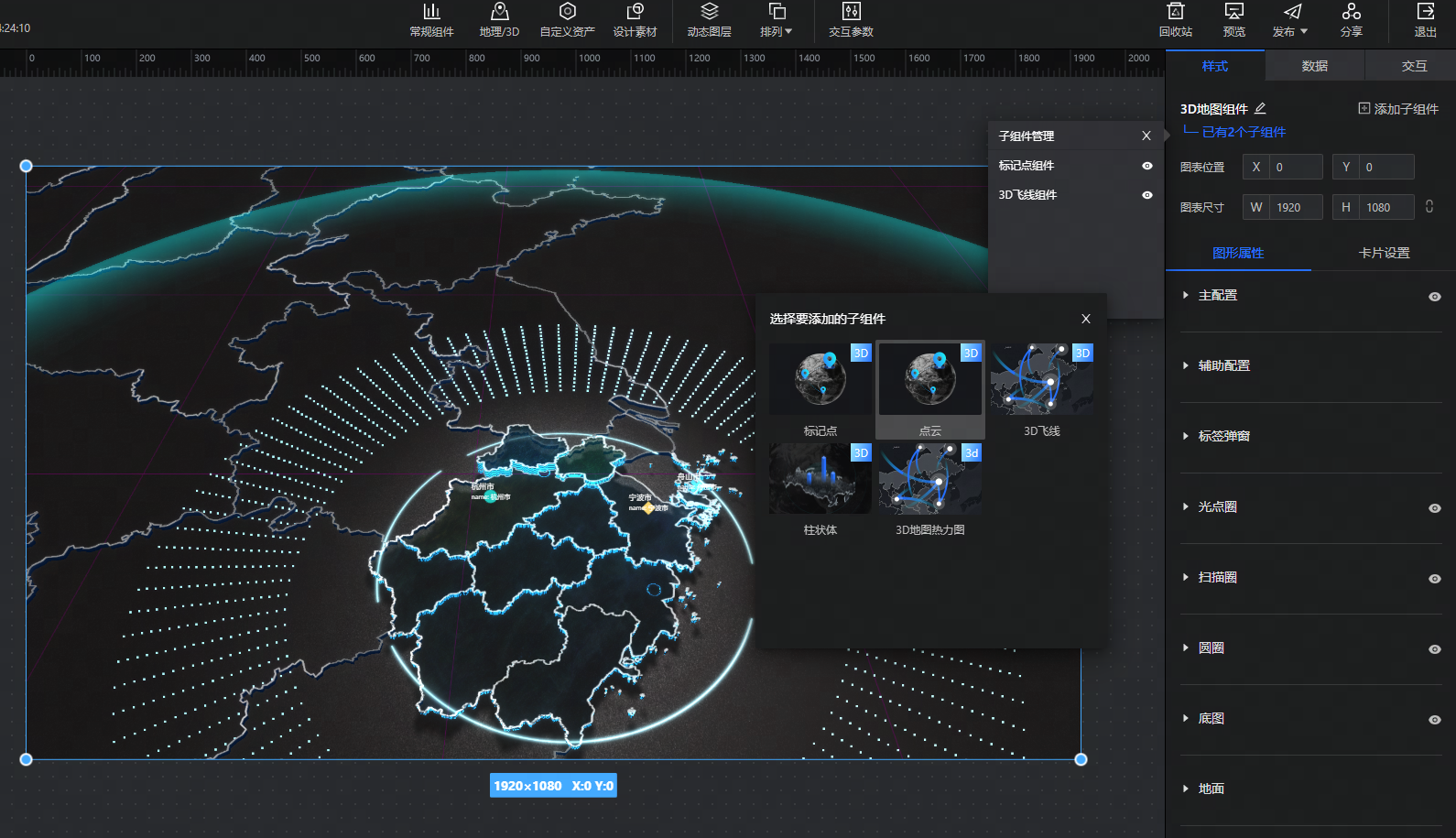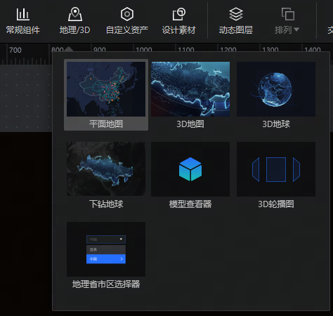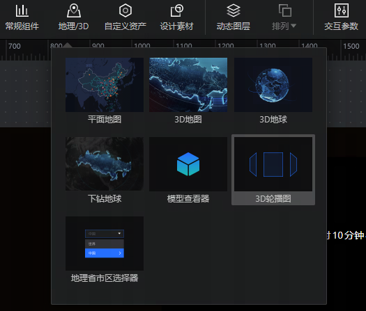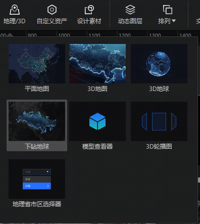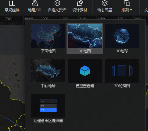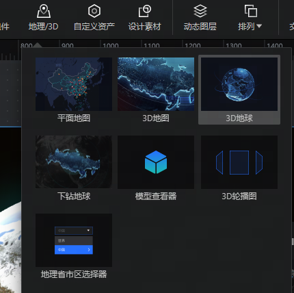 呈现地理类数据时,可实现从3D地球下钻至平面地图的动效。添加入口如下图所示: