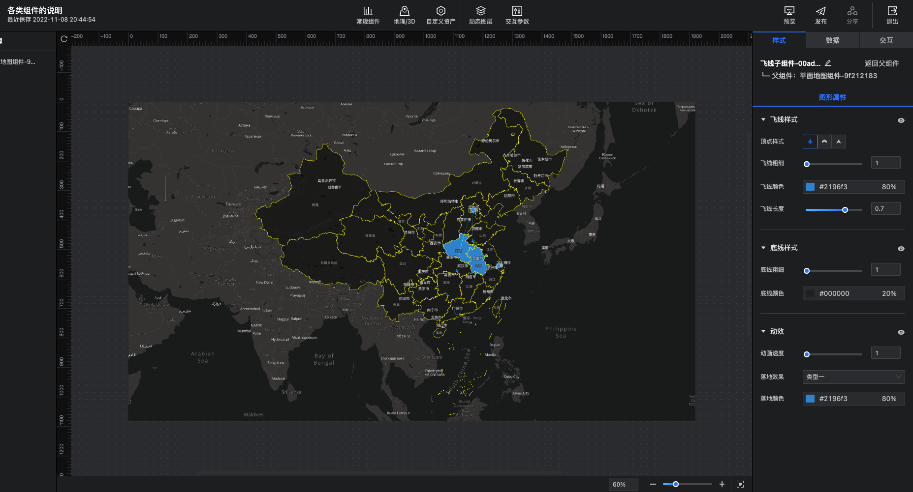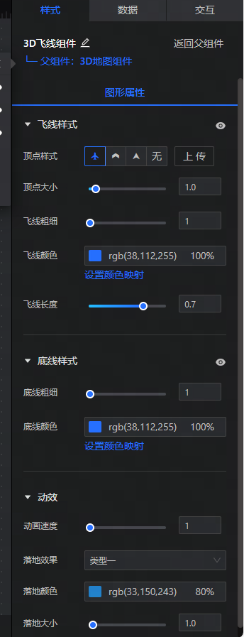 • 动效:设置飞线的动画速度、落地效果、落地颜色等。