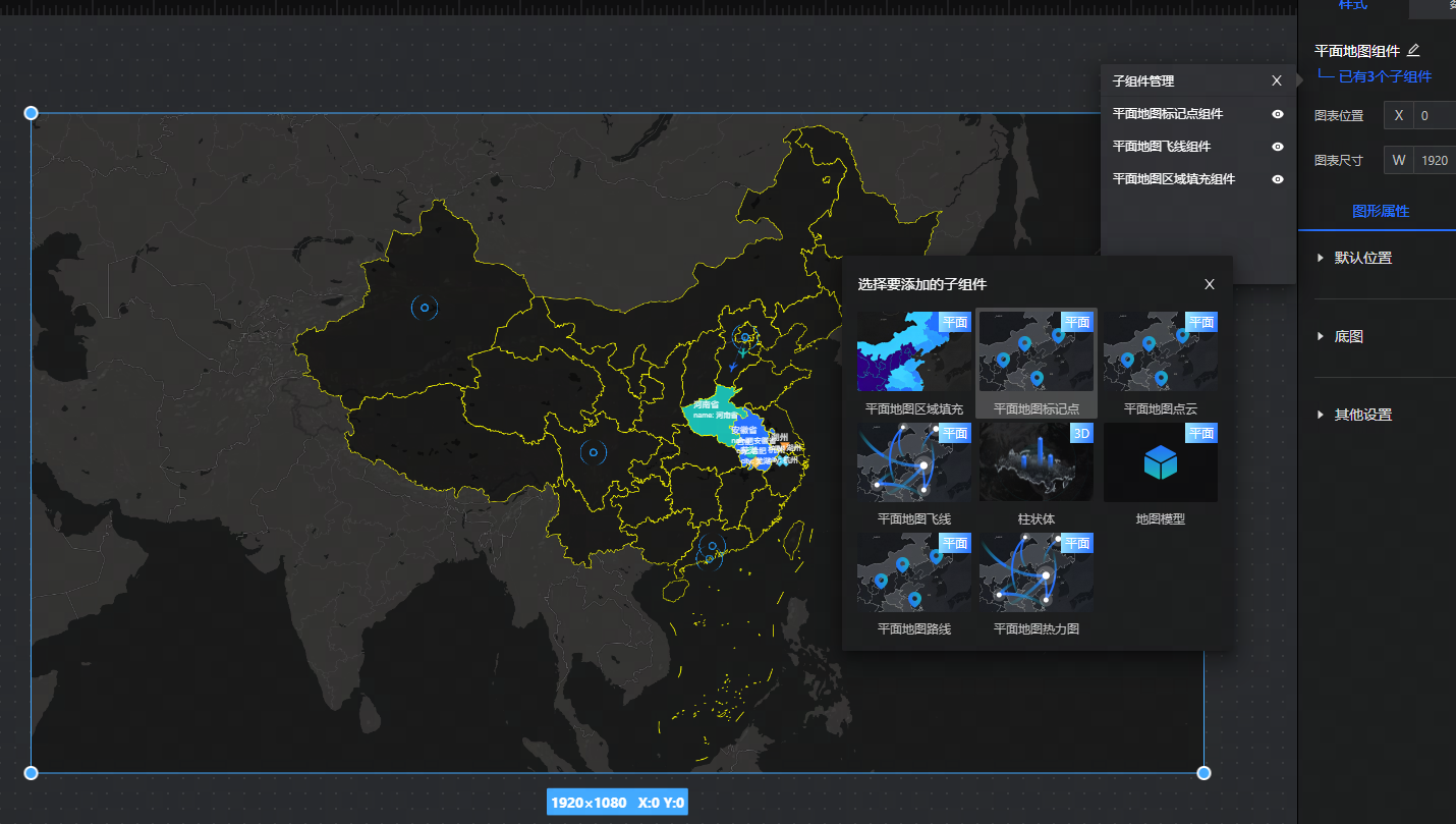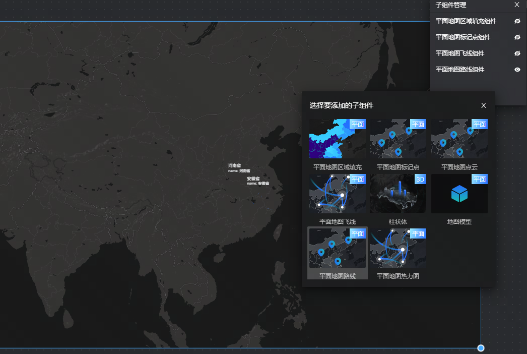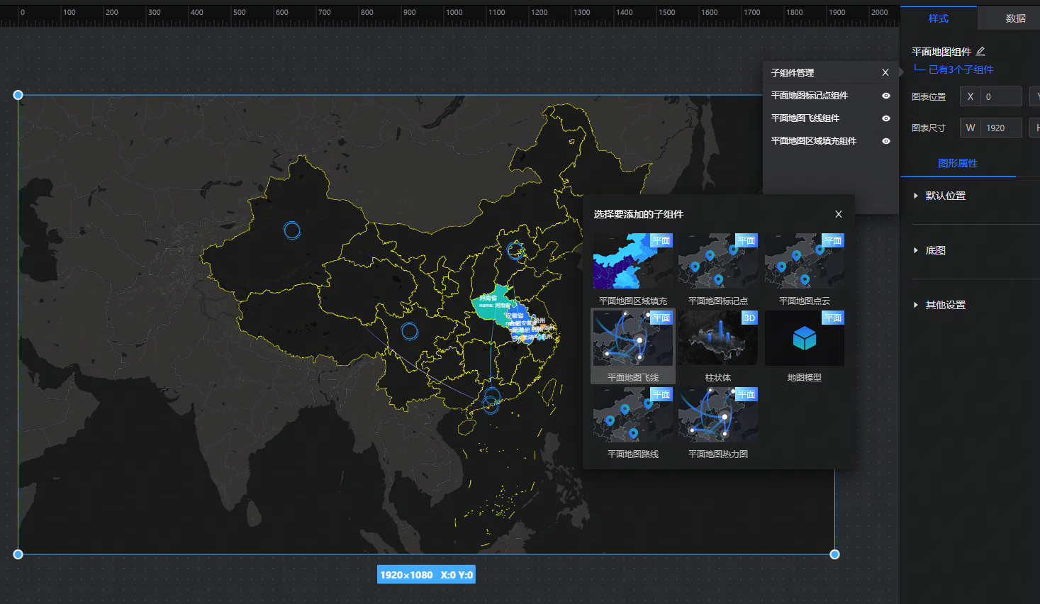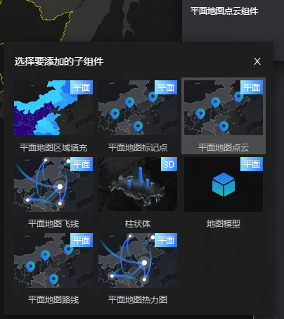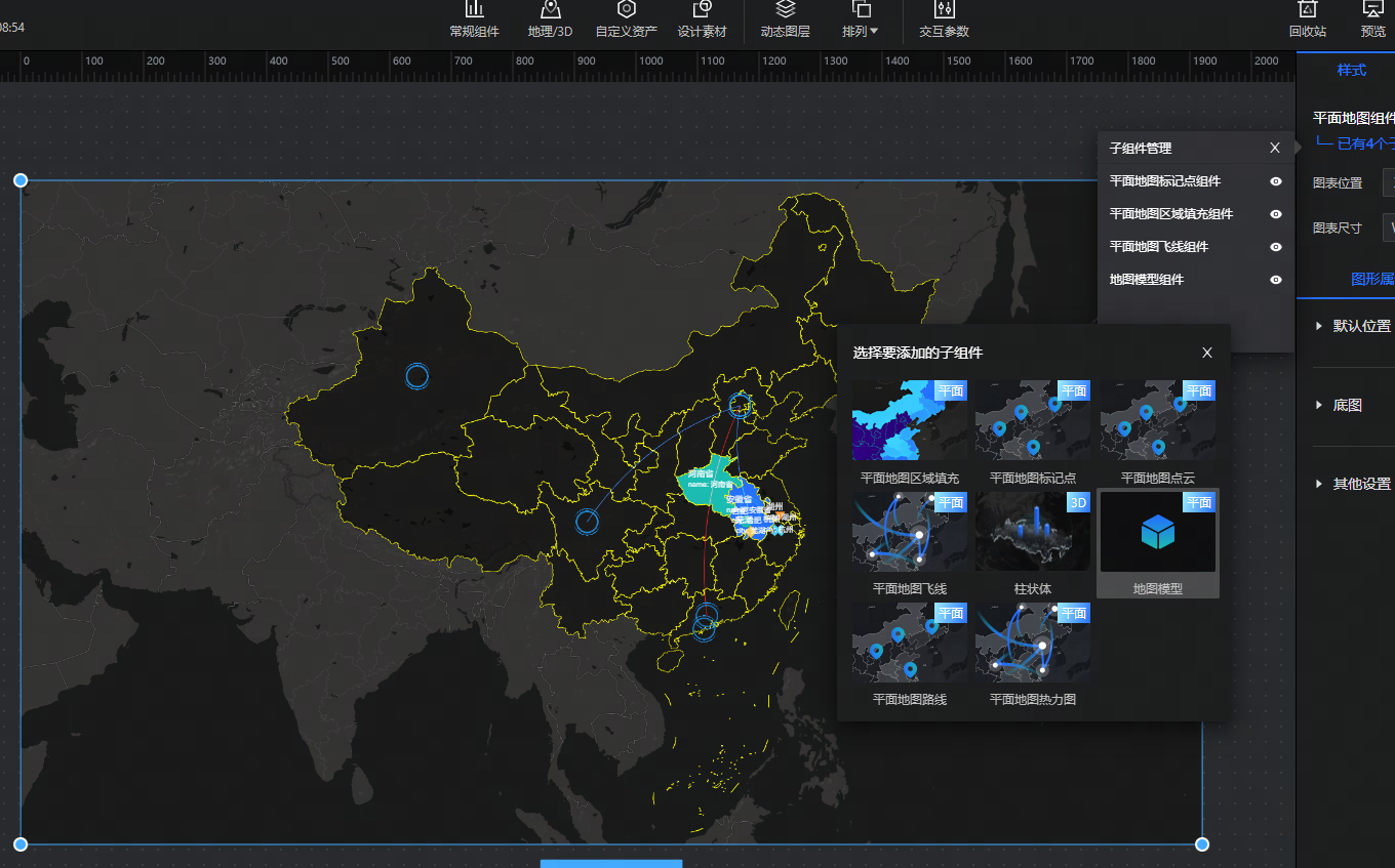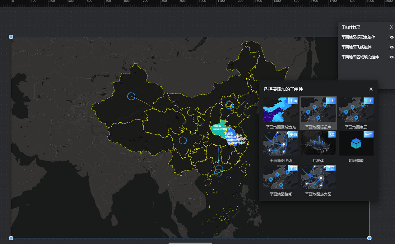 平面地图目前支持标记点、区域填充、飞线、底图等子组件。