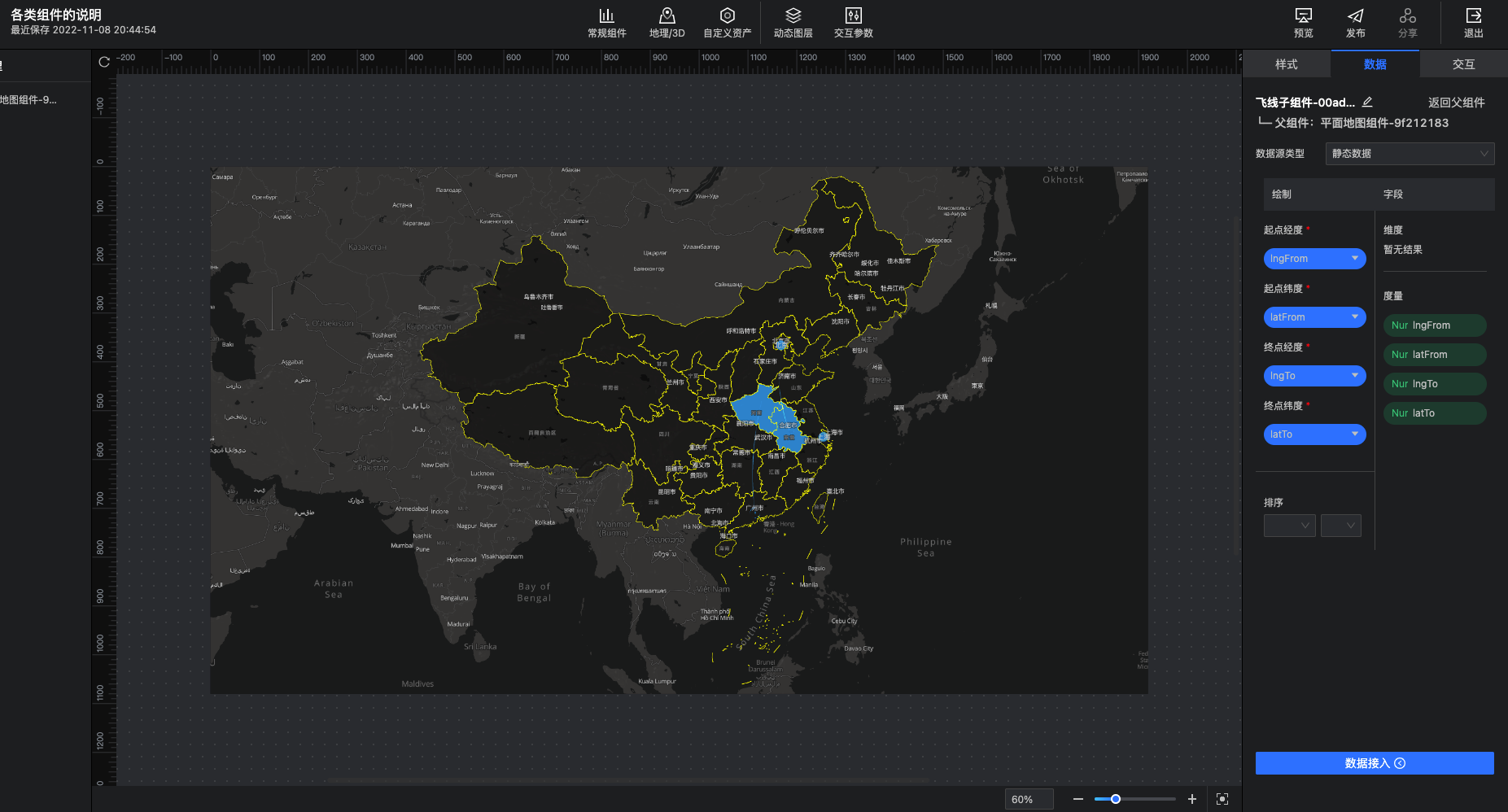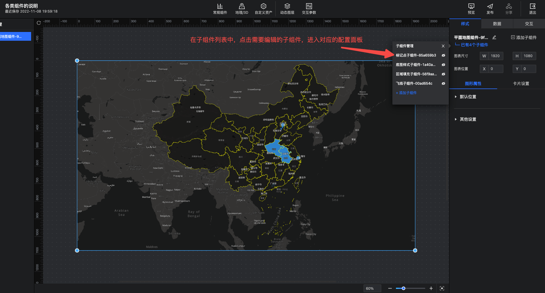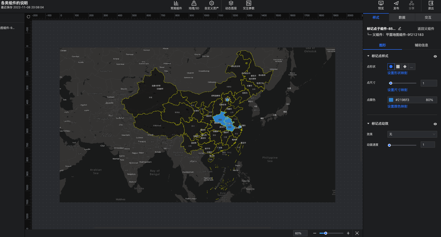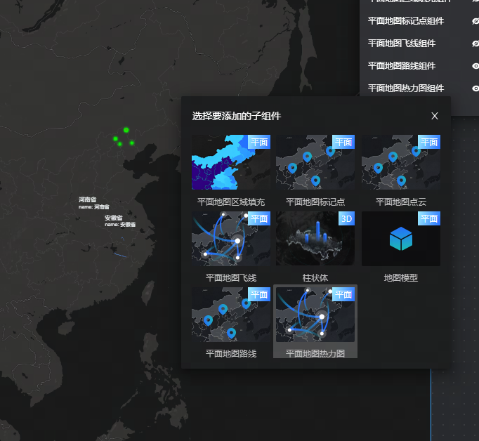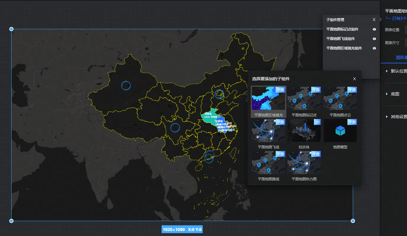 平面地图目前支持标记点、区域填充、飞线、底图等子组件。