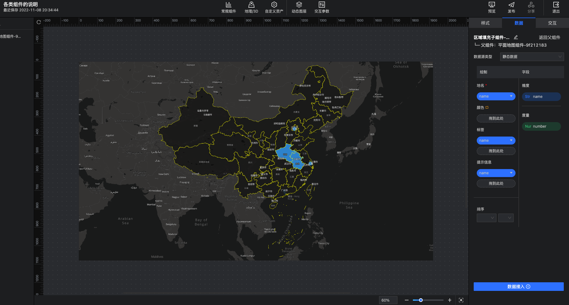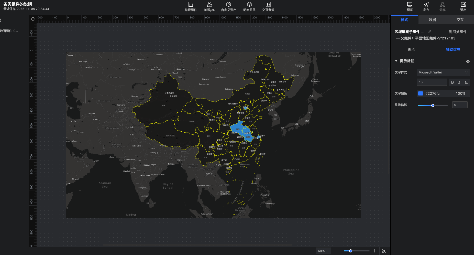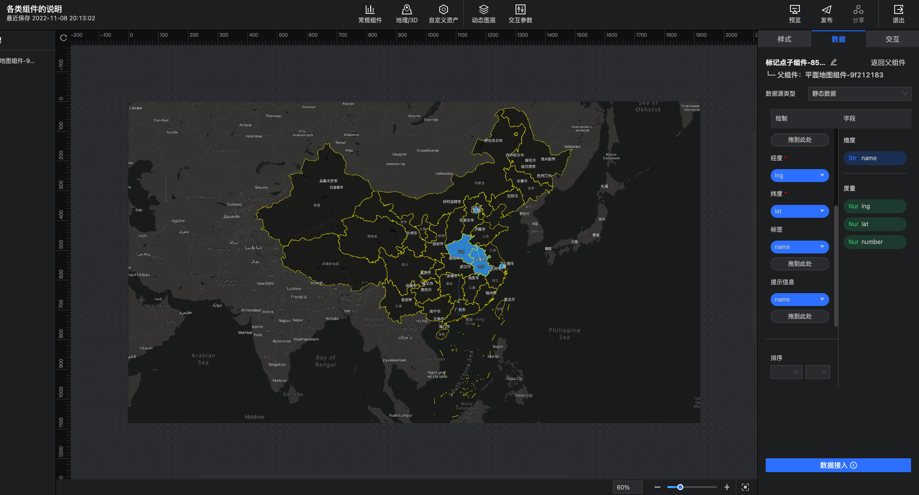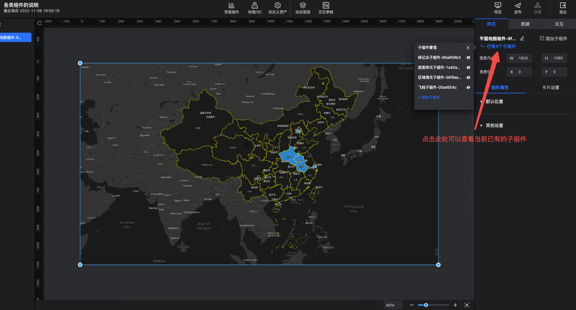 平面地图目前支持标记点、区域填充、飞线、底图等子组件。