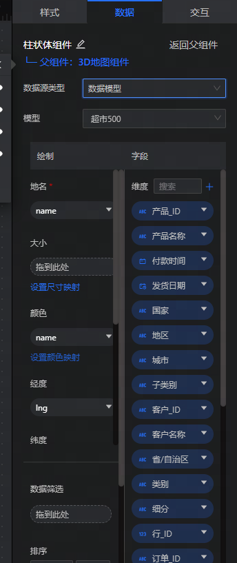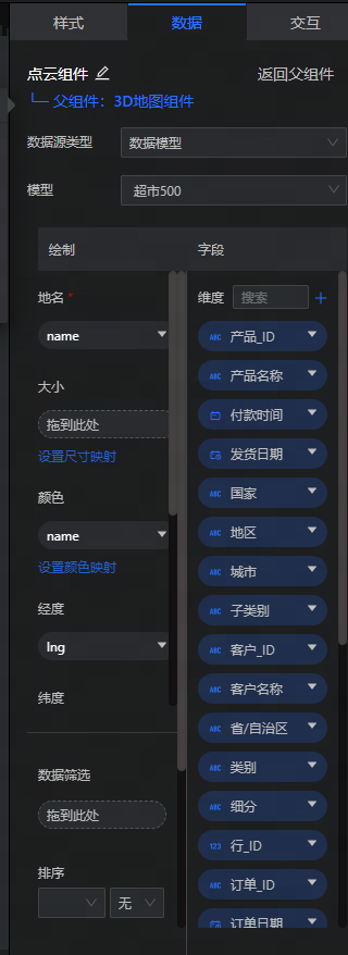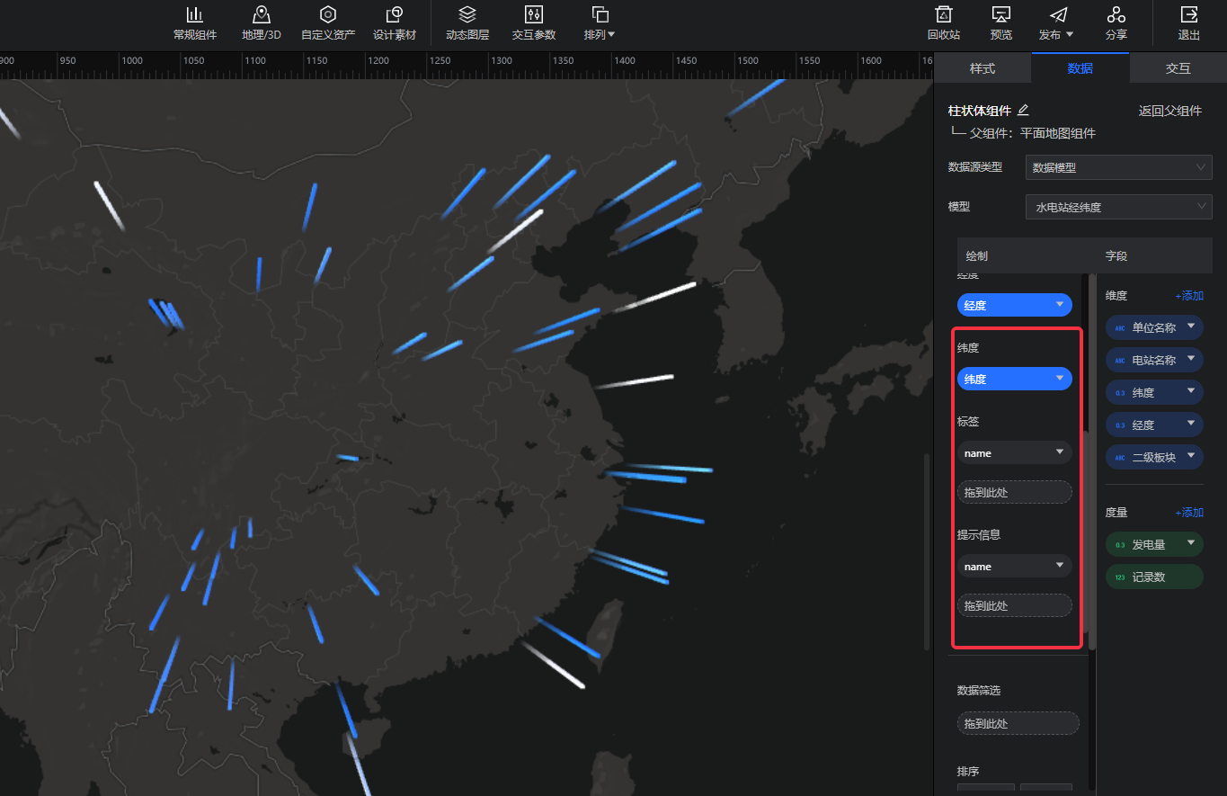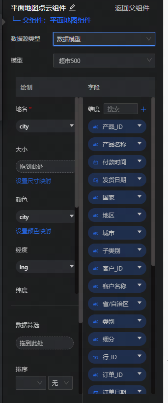 • 绘制地图类图表,拖入地理角色字段时,会根据地理角色匹配到的精准定位来绘制数据项,无法识别的数据项会忽略不绘制