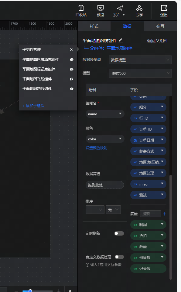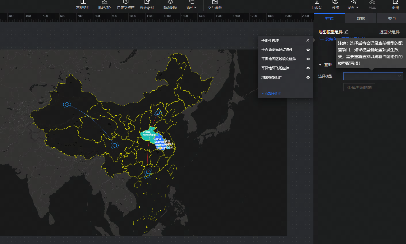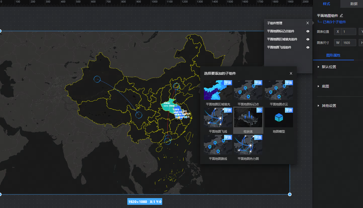 地图组件的绘制方式,跟其他图表组件不太一样。地图组件可以添加子组件,每个子组件可以分别配置数据。可添加多个子组件,相当于多个数据图层(比如一个标记点层+一个飞线层)叠加在一起。