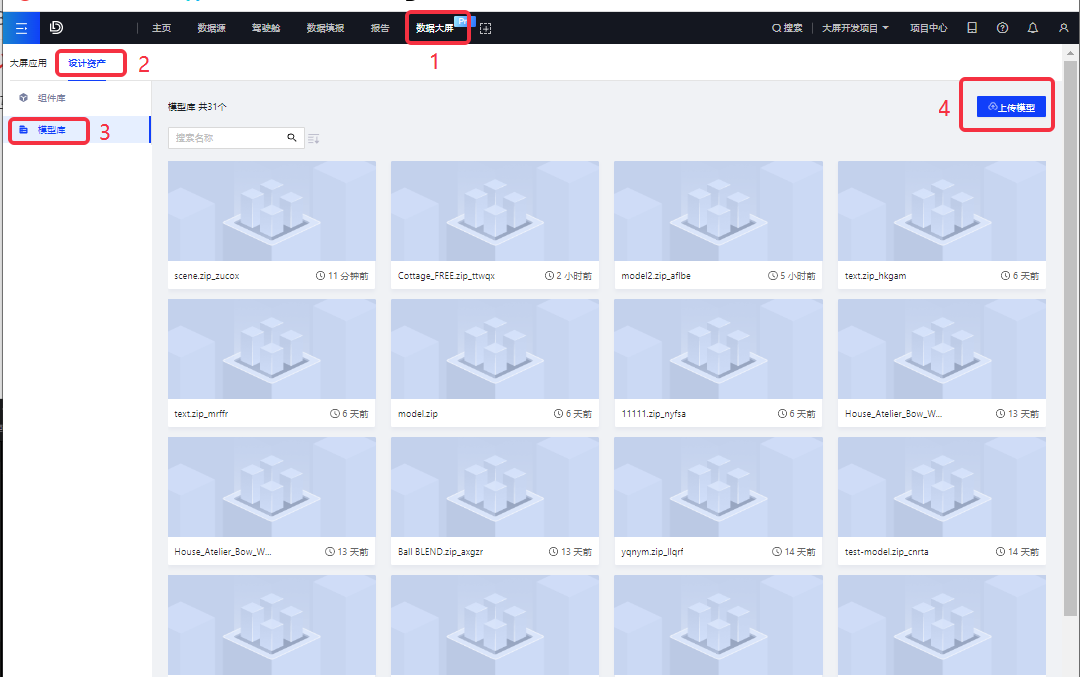 找到对应的模型压缩包,点击上传(现支持GLTF,GLB,FBX,OBJ,ADE格式的zip格式压缩包)