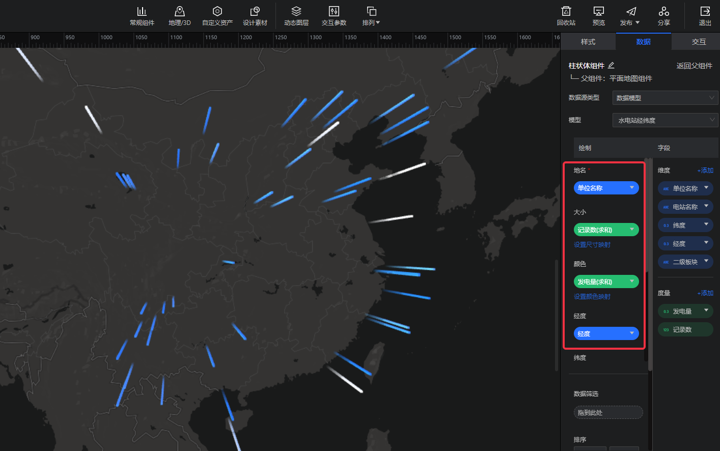 • 颜色:可以拖入字段,用柱状体颜色反映数据,比如拖入“发电量”,则发电量越大,柱状体的颜色也越深。