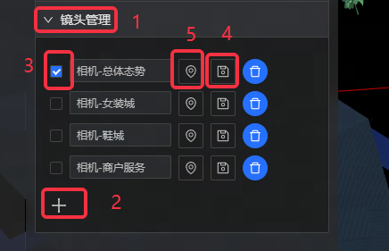 点击设置添加相机,选择好合适的视角之后,依次按序号设置(鼠标左键旋转,右键移动,中键缩放) 按4保存当前视角,按5是定位到相机位置。