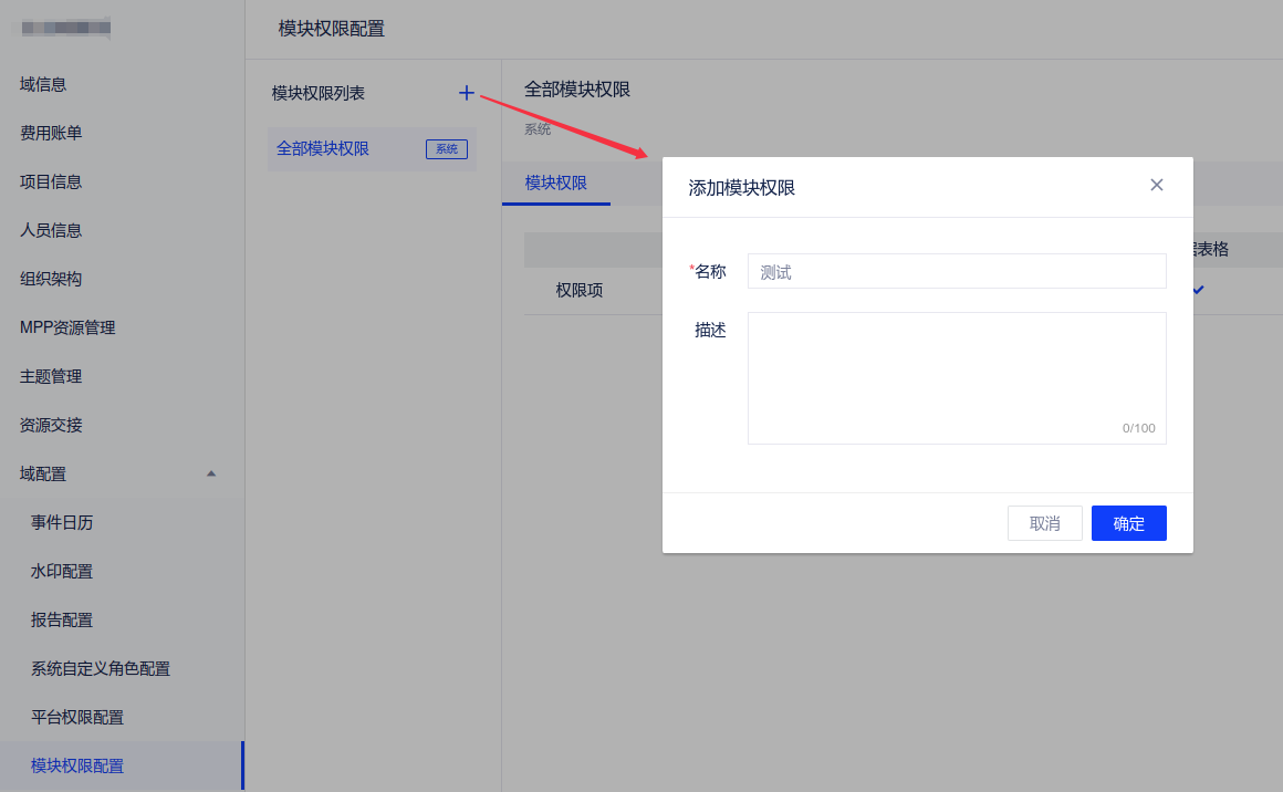 步骤一:以域管理员或域主身份进入[平台管理]-[域配置]-[模块权限配置],添加一个模块权限