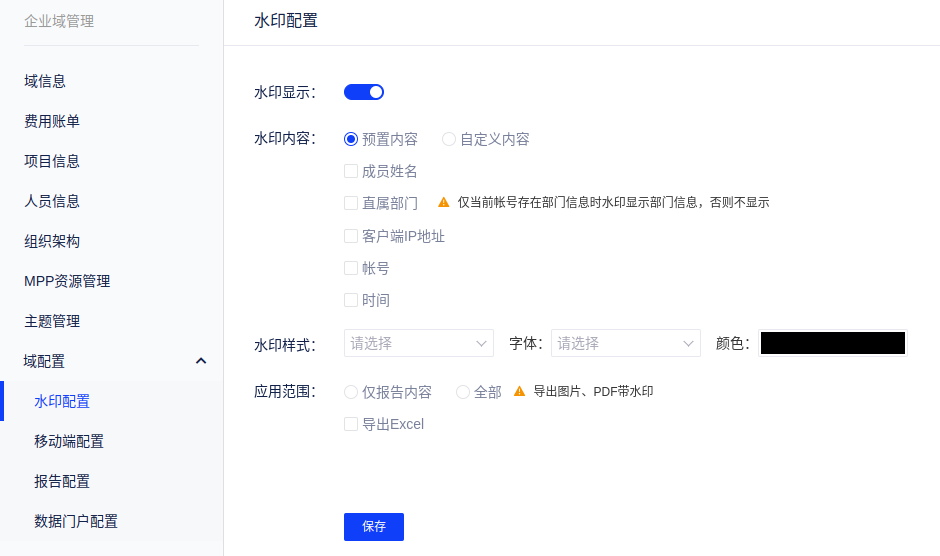 对于安全要求比较高的企业,建议使用该功能,域管理员可以设置自定义水印、也可以使用预制内容获取成员姓名、当前账号、IP地址等信息,帮助您有效防止数据泄露。