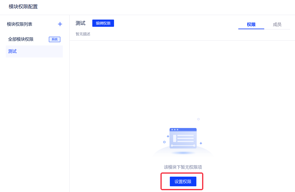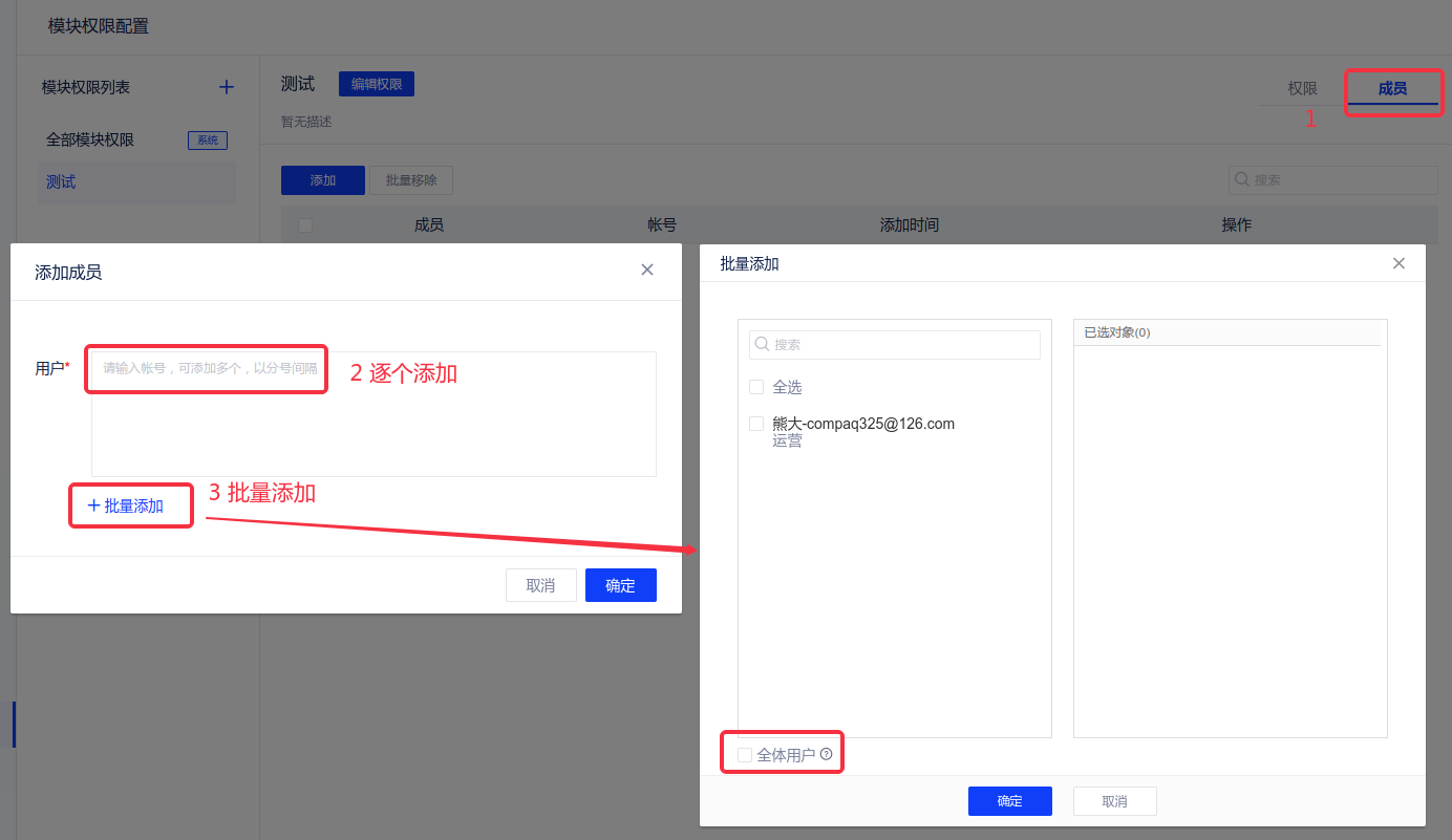 步骤三:在成员tab中为该模块权限添加用户,支持批量添加和添加全体用户;