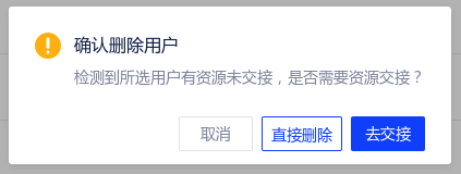 (2)在[人员信息]-[人员列表]删除用户时,若用户名下有归属的资源,则会有拦截提示;点击“去交接”即可跳转前往交接资源页面。