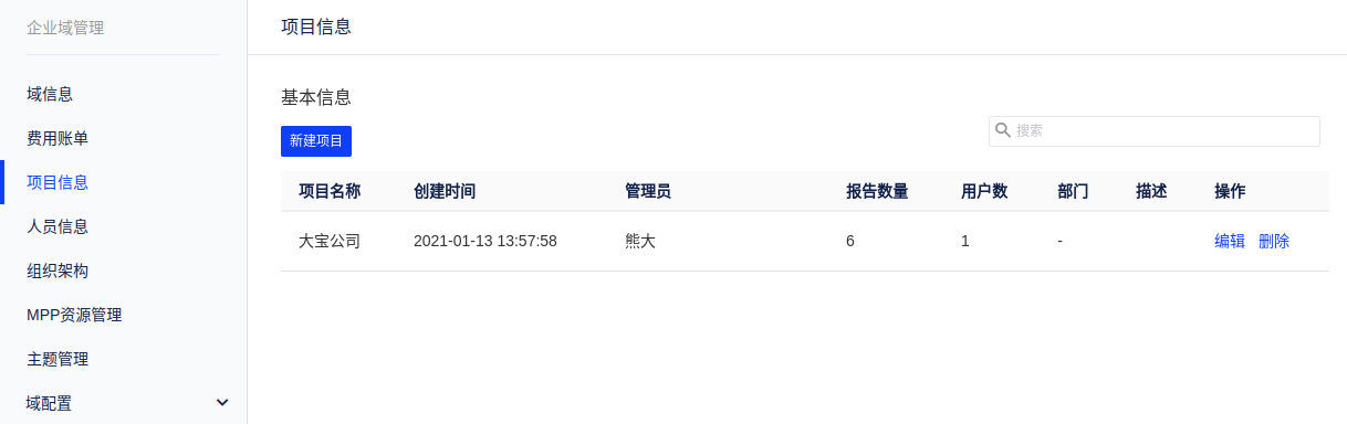 展示当前域下面创建的所有项目,并可对项目进行编辑、删除操作。