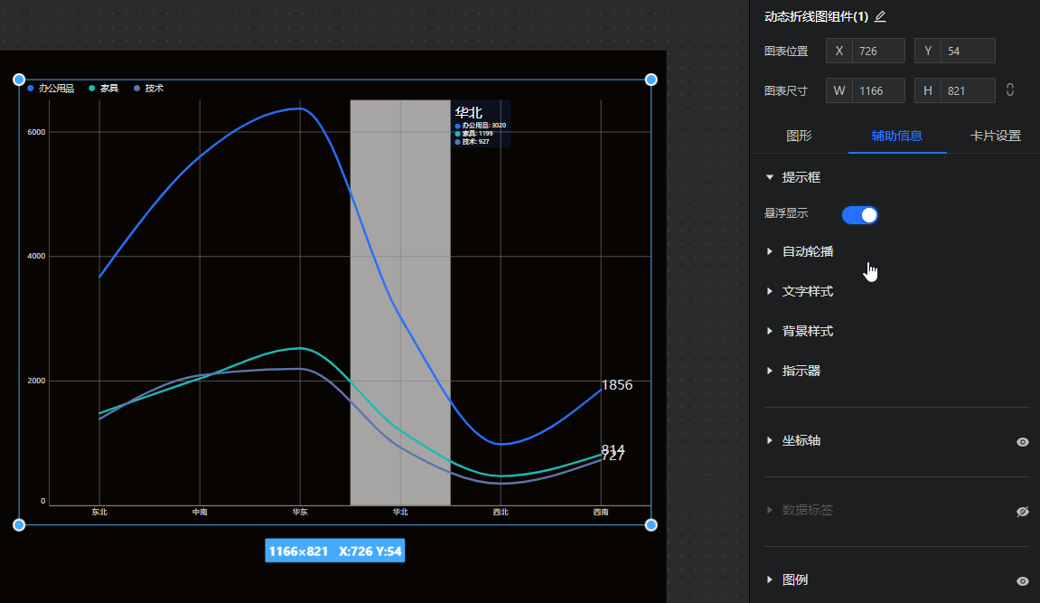 - 坐标轴:设置是否显示坐标轴,支持X、Y轴分别设置轴标签、轴线和轴标题。