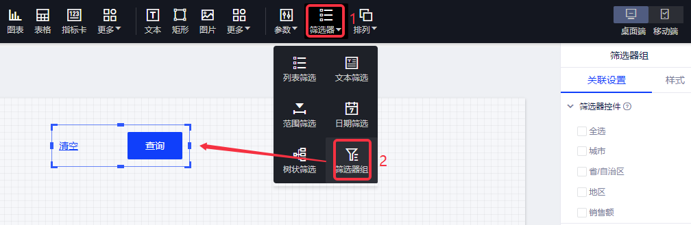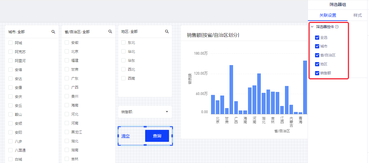 1.概述2. 快速入门1.概述本产品可将多个筛选器组成筛选器组,组内的筛选器变更选项后不会立即对图表生效,等组内多个筛选器都完成变更操作后再一起对图表生效。这样一来,减少了不必要的数据查询,可提高需要变更多个筛选器选项时的操作体验。 筛选器组的使用效果如下图所示: 2. 快速入门将多个筛选器组成筛选器组的操作步骤如下: (1)在报告编辑页面,选择“筛选器组”控件,在画布上添加一个筛选器组; (2)选中筛选器组,在设置面板中勾选需要影响的筛选器,被选择的筛选器将组成筛选器组,并受“筛选器组”控件影响,即完成设置;