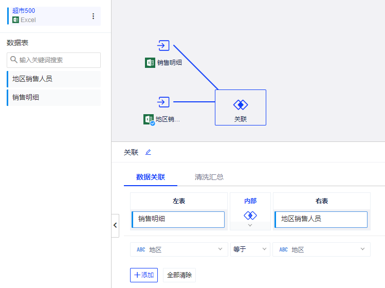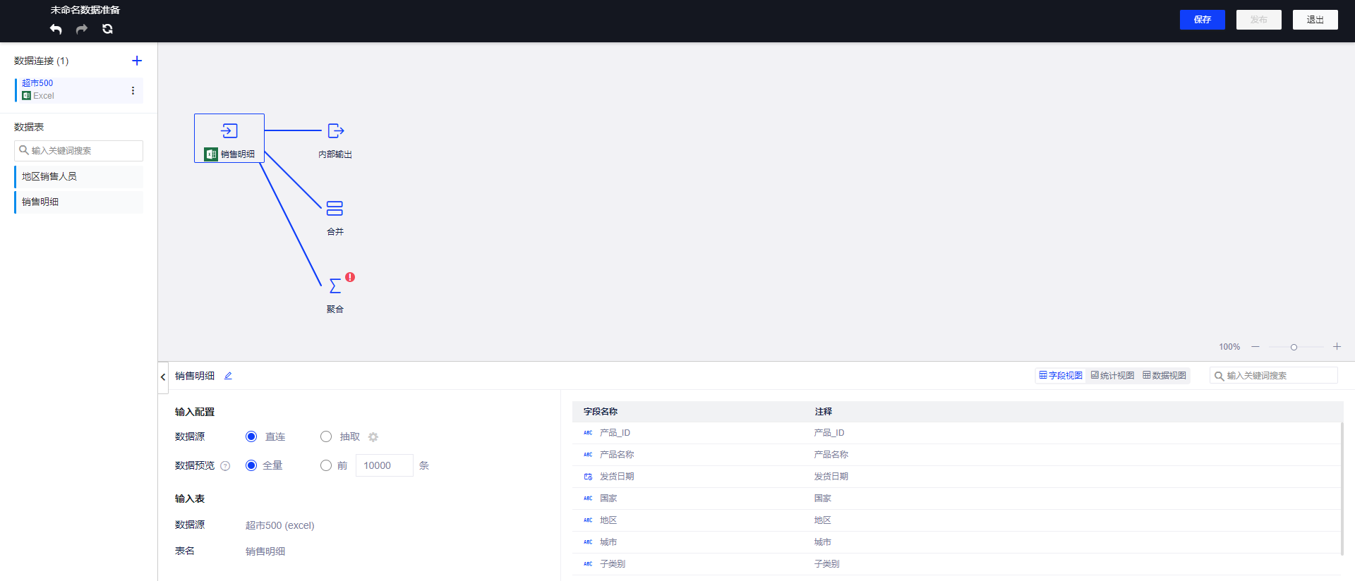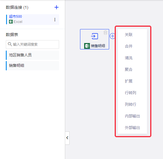 承接数据连接,数据准备(轻量ETL)可以将数据源表中的数据进行清洗、聚合、关联等操作,并将加工后的数据输出,建立数据模型。