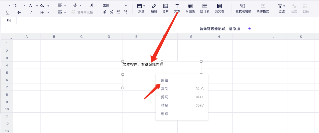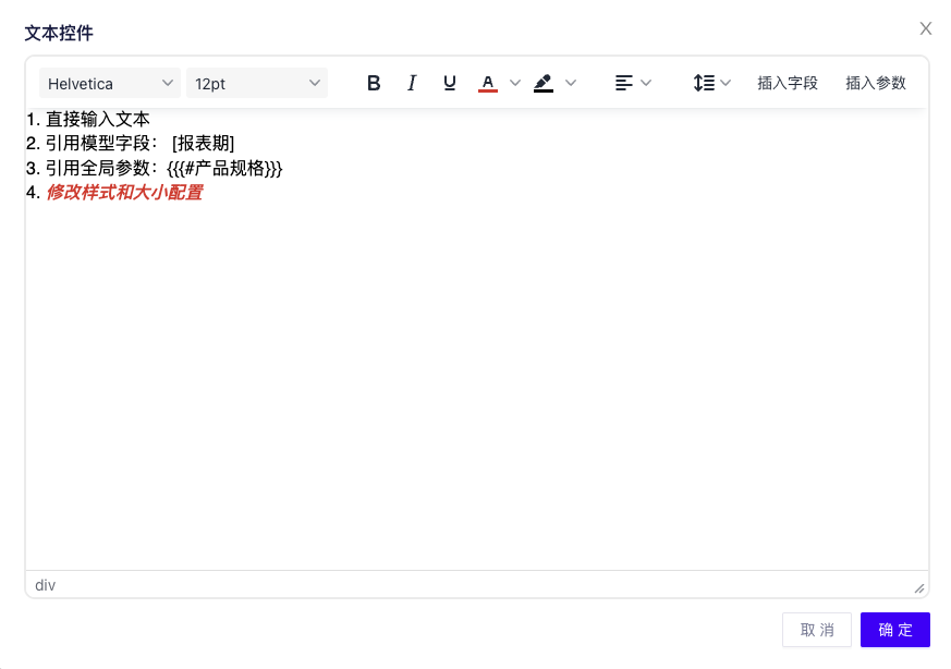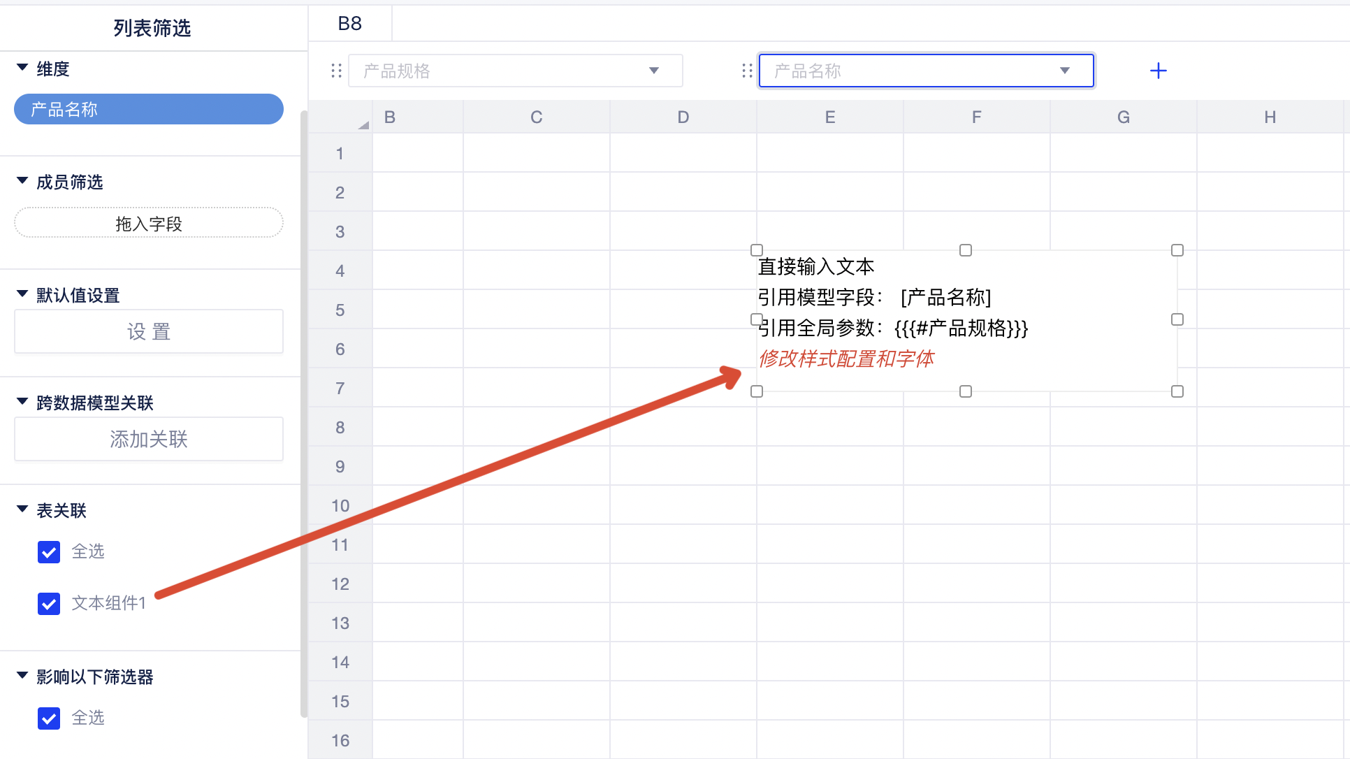 表格中插入悬浮文本,作为页面标题,产品描述等。文本中支持插入内容,引用字段和全局参数。