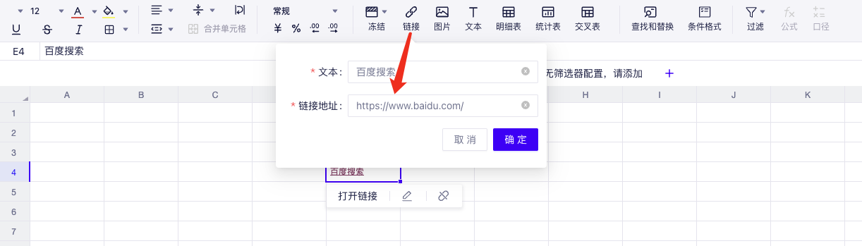 - 顶部工具栏 --> 插入超链接 --> 系统将会在对应单元格插入超链接