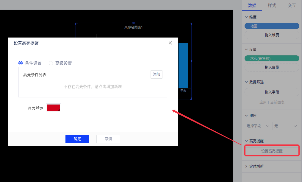 在图表的数据控制面板,点击“设置高亮提醒”按钮进入高亮提醒设置页面,高亮提醒有条件设置和高级设置两种方式。