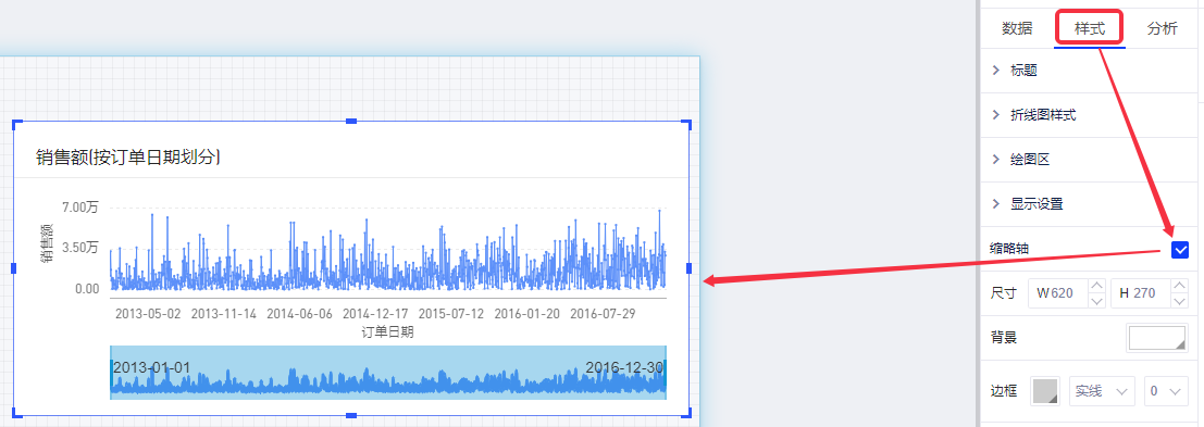 1. 概述2. 设置1. 概述查看图表数据时,您可以通过拖动轴选择想要查看的数据区域,以查看详细的数据。 支持图表:柱状图、区域图、折线图、直方图、组合图 2. 设置选中图表,选择右侧配置区的样式tab,点击选中缩略轴,即完成缩略轴的设置。缩略轴拖动时,会显示两端的值。 缩略轴拖动时,会显示两端的值。