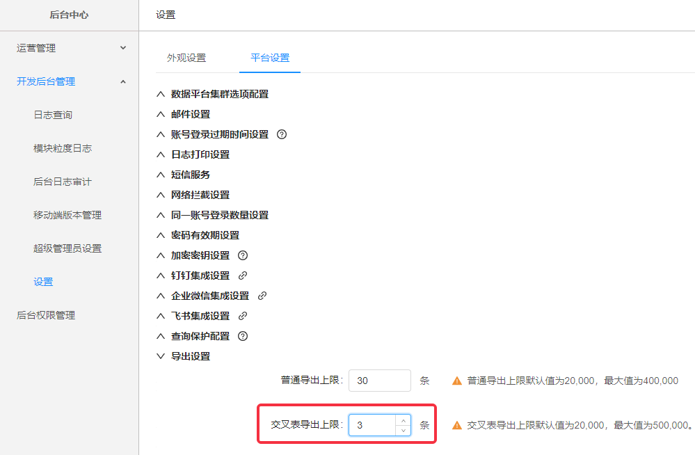 可至“后台管理-设置-平台管理-导出设置”设置导出上限(该设置适用于私有化部署版本,SaaS版本不支持)。