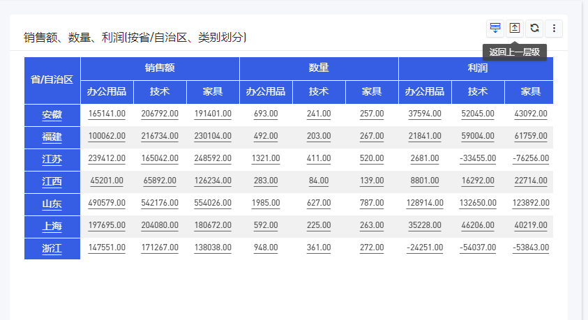 以默认数据模型为例,查看各地区的产品销售额、利润、数量,将涉及到4个字段:维度“类别”、“地区”,度量“销售额”、“利润”、“数量”。