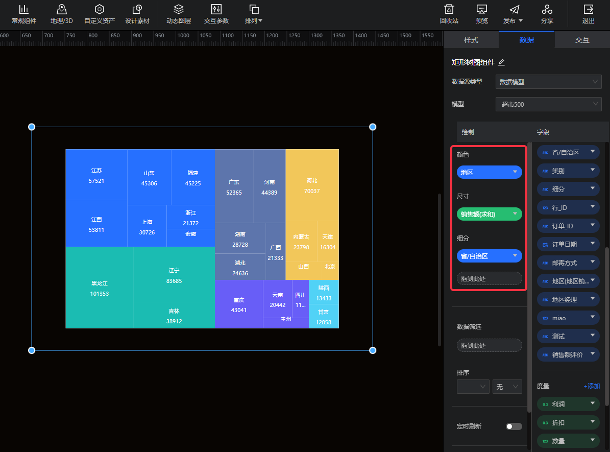 - 细分:设置矩形树图的维度字段,如下图所示为“地区”。