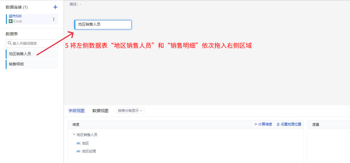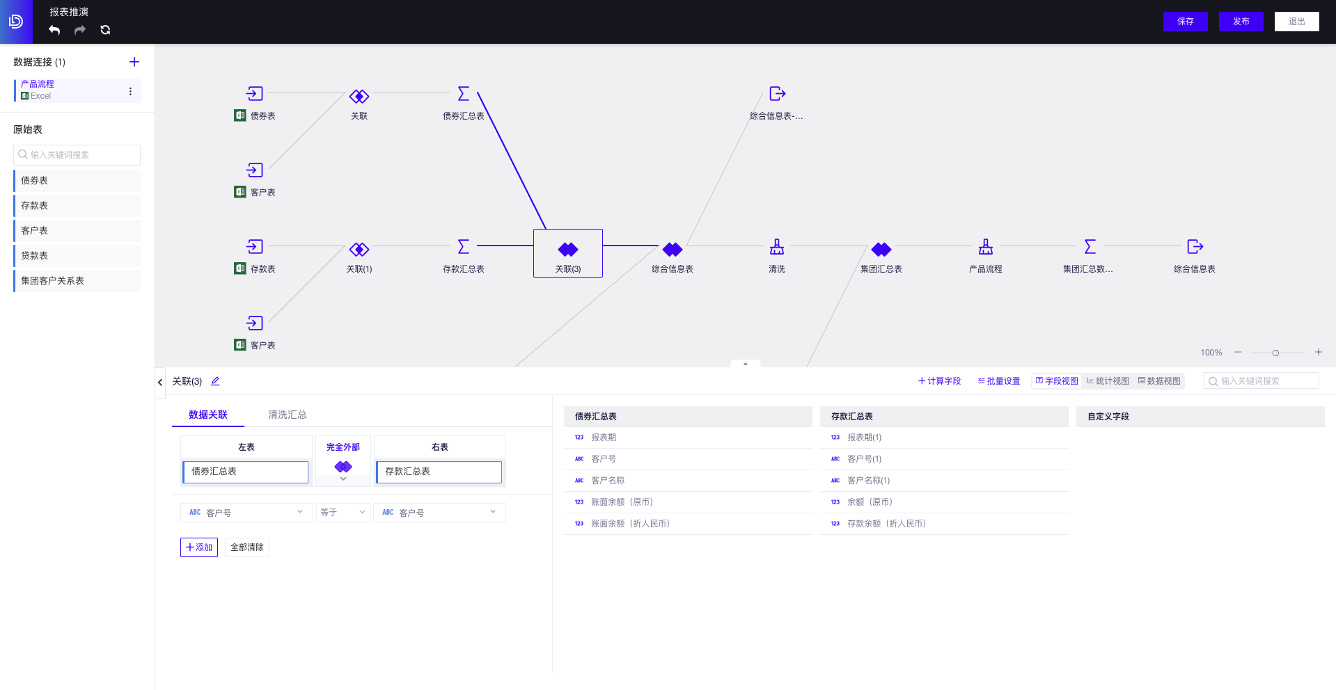 在[数据源]模块,基于上一步建立的[数据连接]来创建数据模型,将需要的多张数据表进行关联,并可以进行一些数据处理操作(比如重命名字段、空值过滤、添加自定义字段等等),示例如图所示(这里只做简单的内部关联)