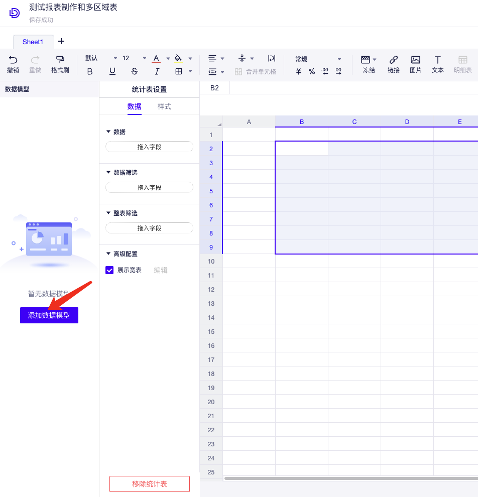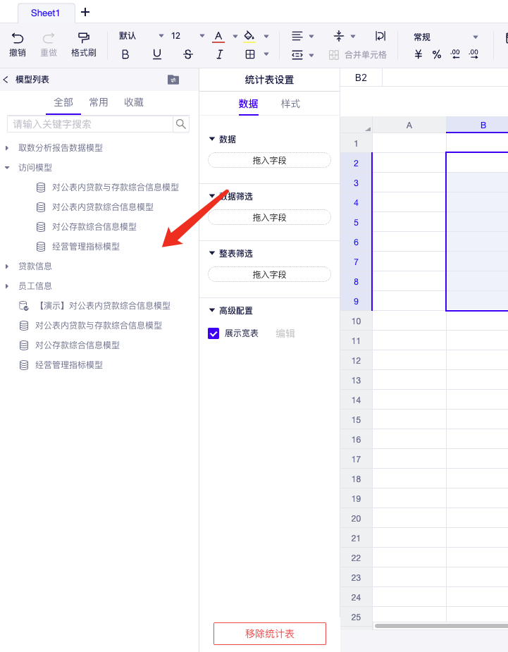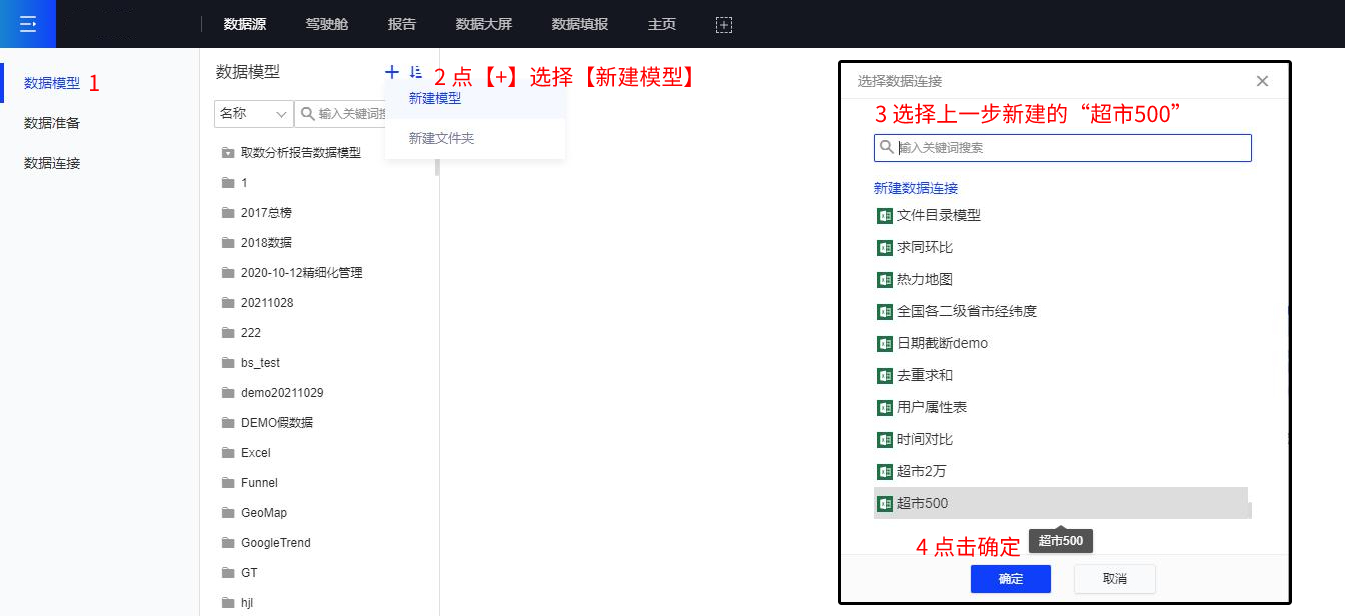 (2) 添加和选择数据模型:选择需要用到的数据模型