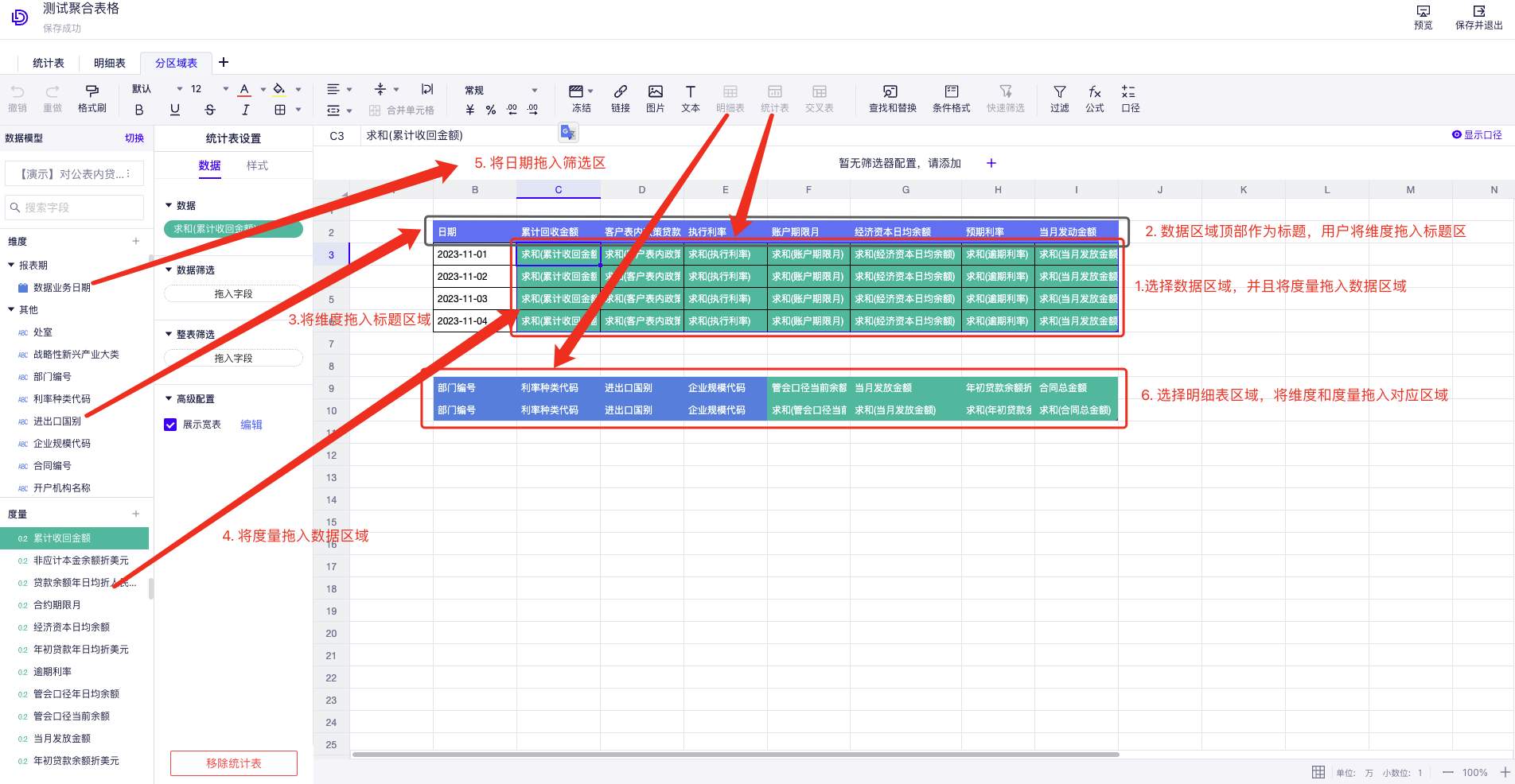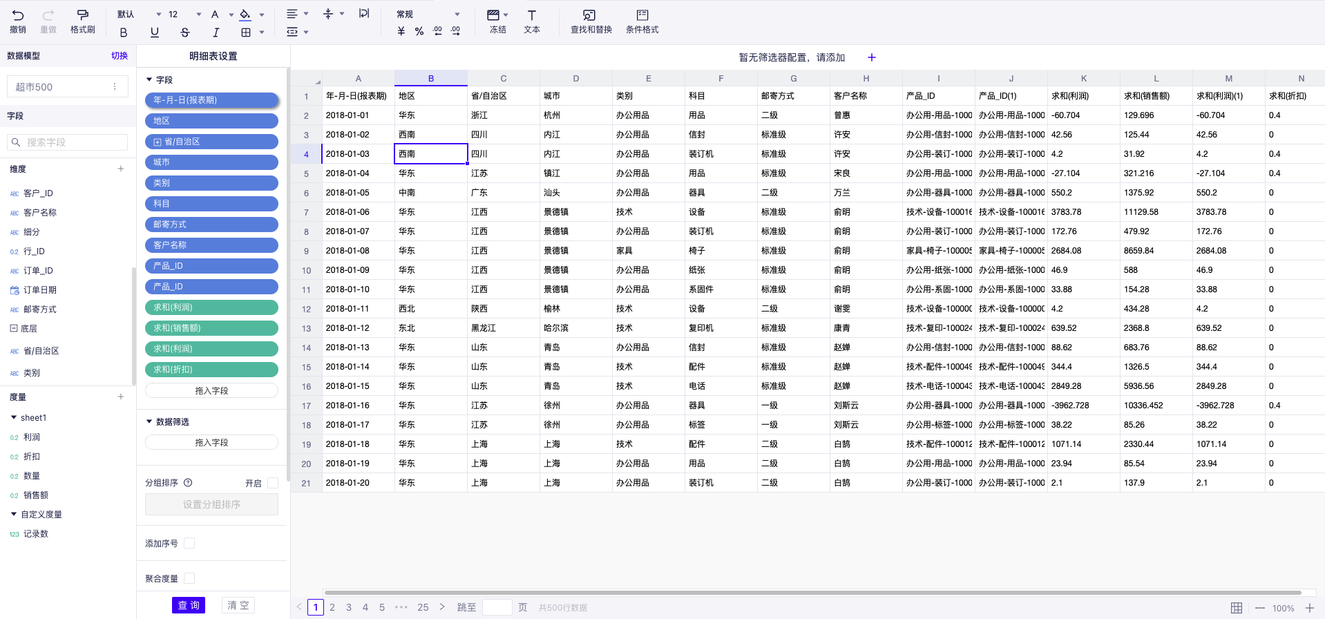(3) 快速查询:将需要分析的字段拖入明细表配置区域,实现数据的获取和查询
