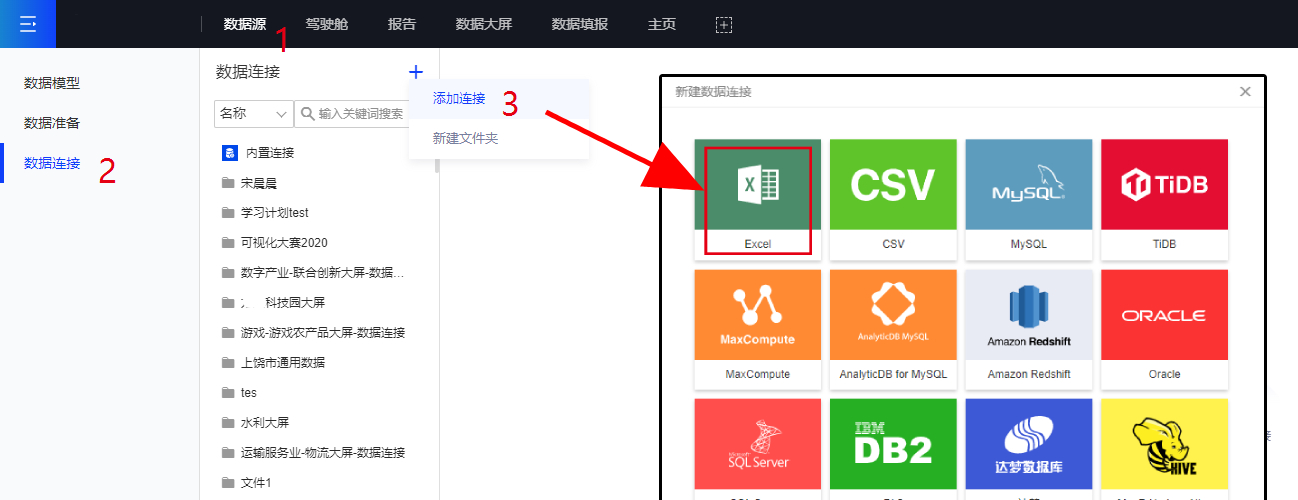 依次点击进入[数据源>数据连接>添加连接],选择需要连接的数据源类型(Excel、CSV、MySQL等)与数据建立连接。示例如图所示(这里添加的是Excel)