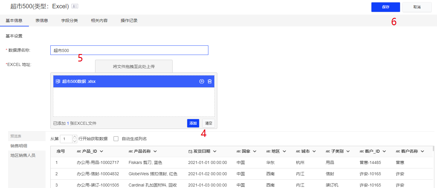 在[数据源]模块,基于上一步建立的[数据连接]来创建数据模型,将数据做清洗和处理,方便后续做数据分析和数据处理。