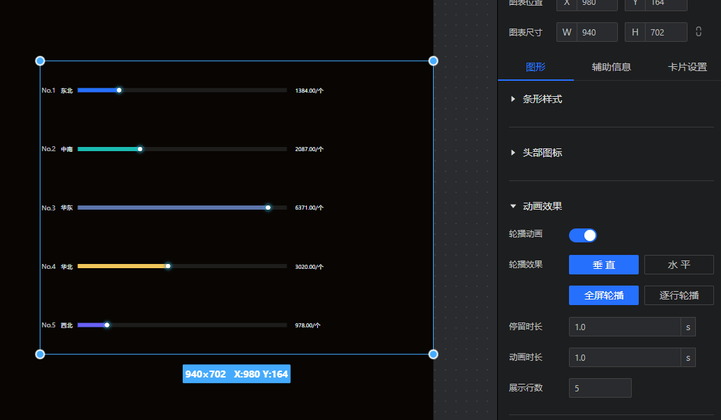 - 动画效果:设置轮播动画、轮播效果、停留时长、动画时长、展示行数。