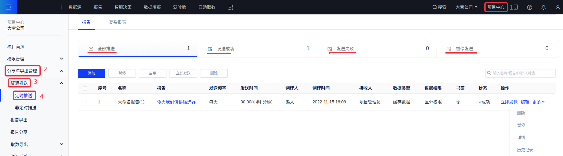 您可以在资源推送页面管理报告和复杂报表的推送任务,查看任务的发送状态,还可以新建、查看、编辑或删除任务,对任务进行立即发送操作。