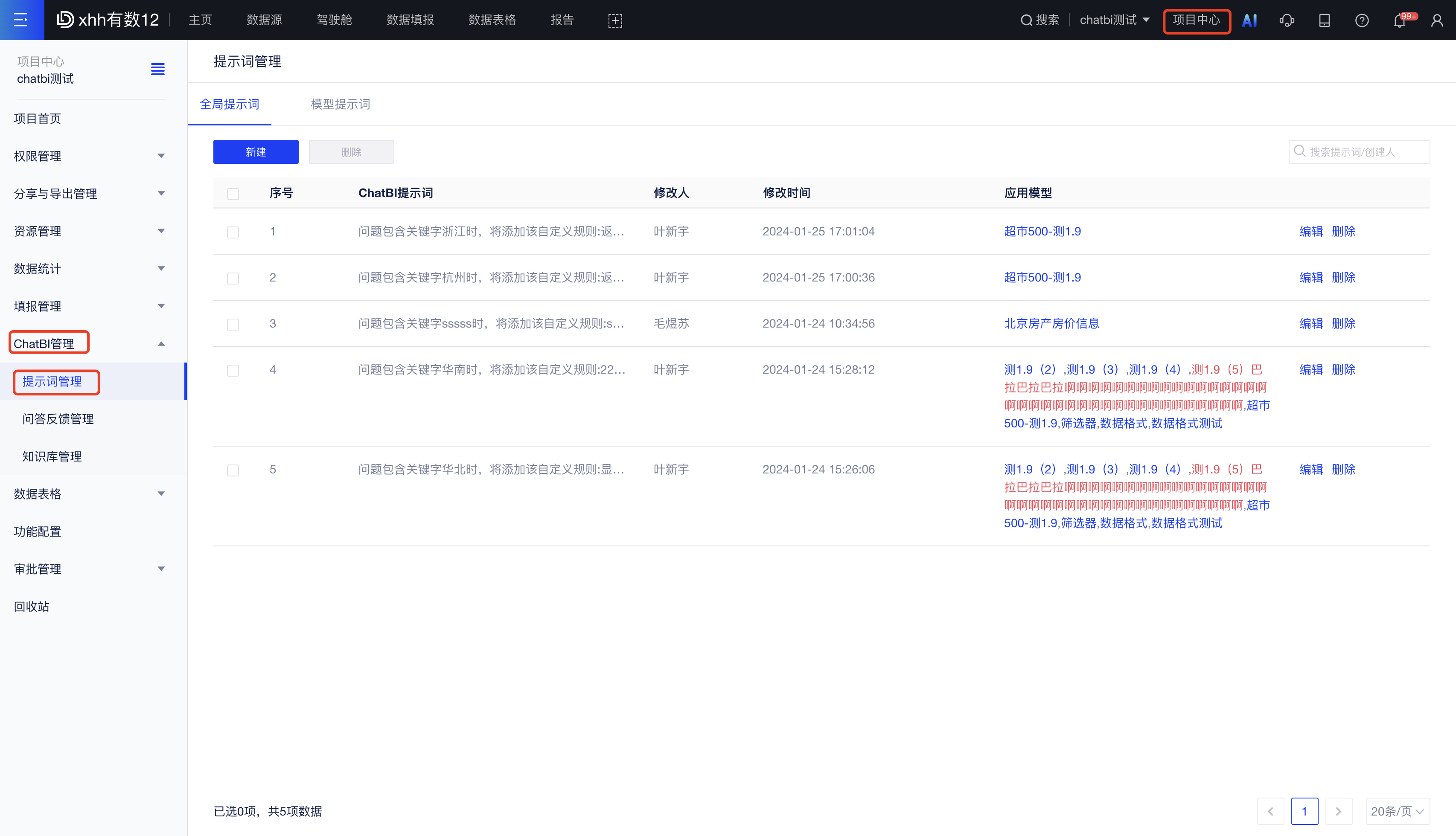 在前文中,我们提到用户在单个数据模型的编辑页面,可对单个模型设置“提示词”,如果有一些通用的提示词,管理员可在项目中心-ChatBI管理-提示词管理-全局提示词进行统一配置(省去在多个模型重复配置多次相同提示词的繁琐步骤)。