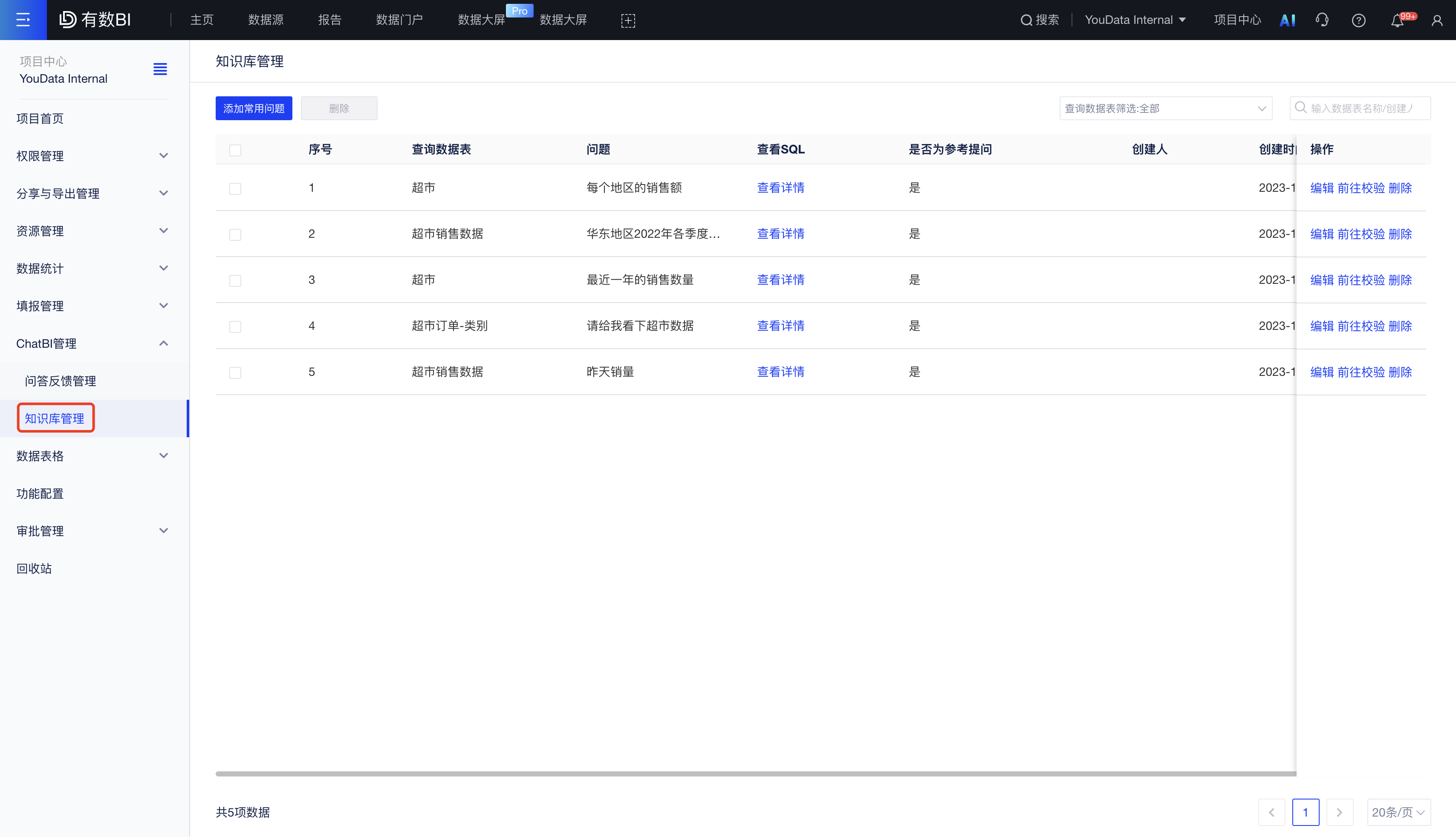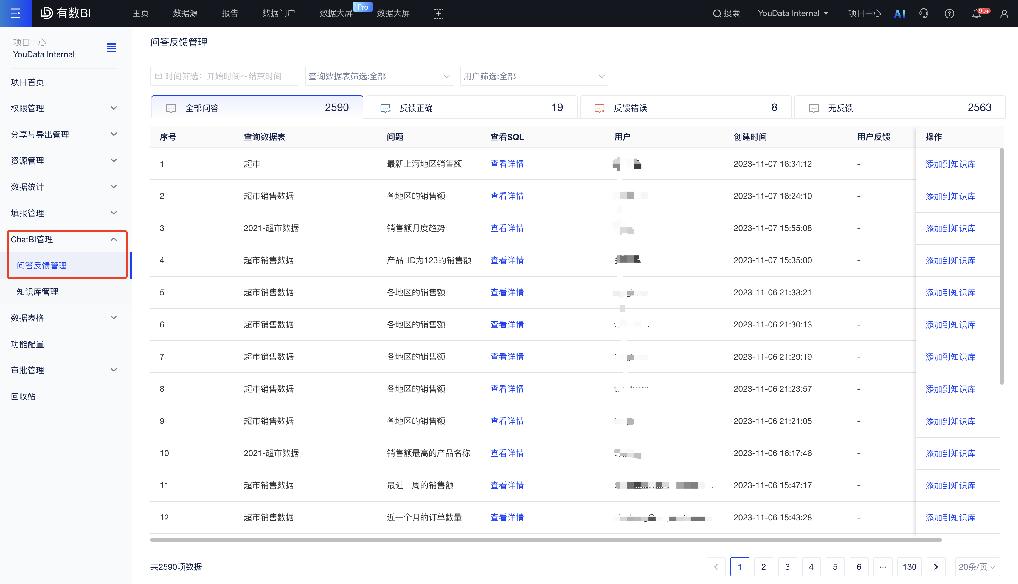 配合用户对模型问答结果的反馈,项目管理员可在项目中心对问答进行运营,还可沉淀一系列针对自有业务场景的数据分析知识库。