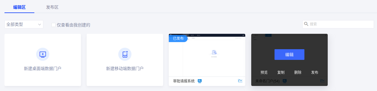 你可在数据门户列表中实现数据门户的预览、编辑、复制以及发布。