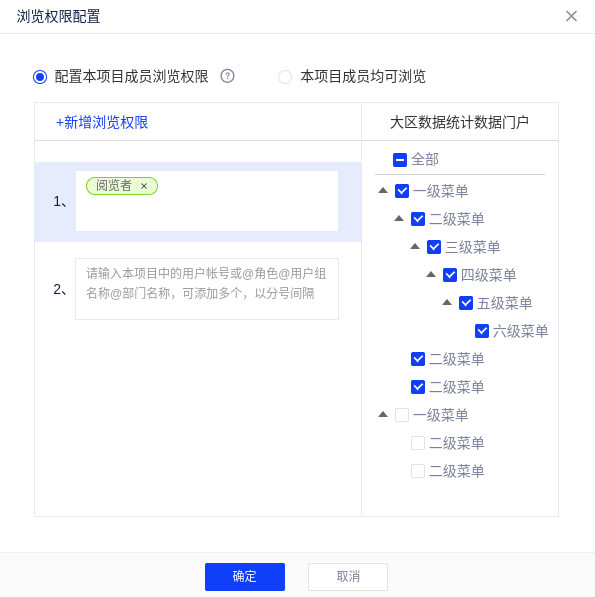 配置访问成员浏览的门户菜单权限,左侧框添加成员信息(可按用户组、角色、部分划分),右侧选择成员可浏览门户的菜单级别;让不同用户拥有不同的浏览权限,重点关注与自己有关的数据。