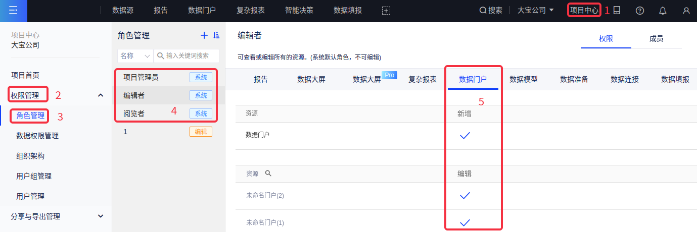 系统(项目管理员、编辑者)角色默认拥有门户资源的新增权限和各个门户的编辑权限;