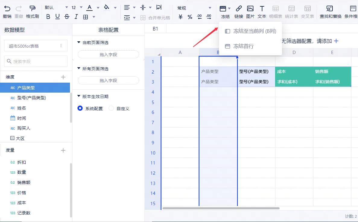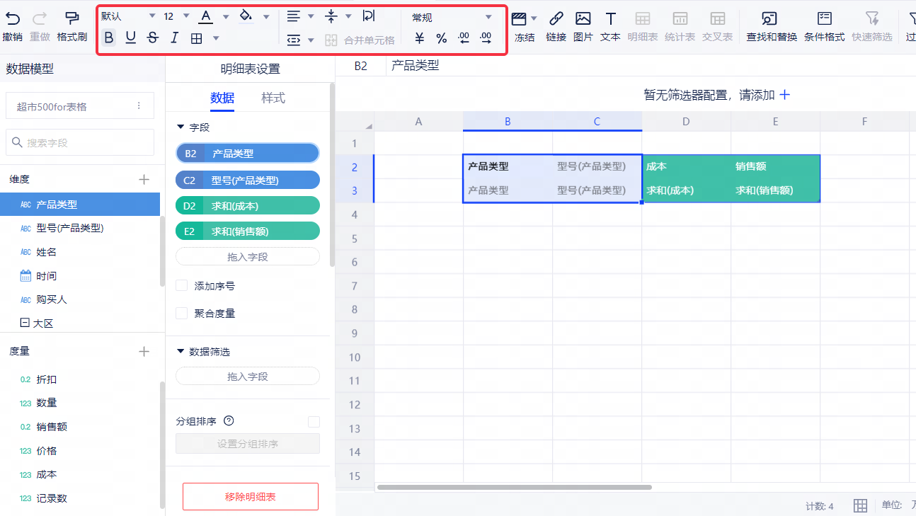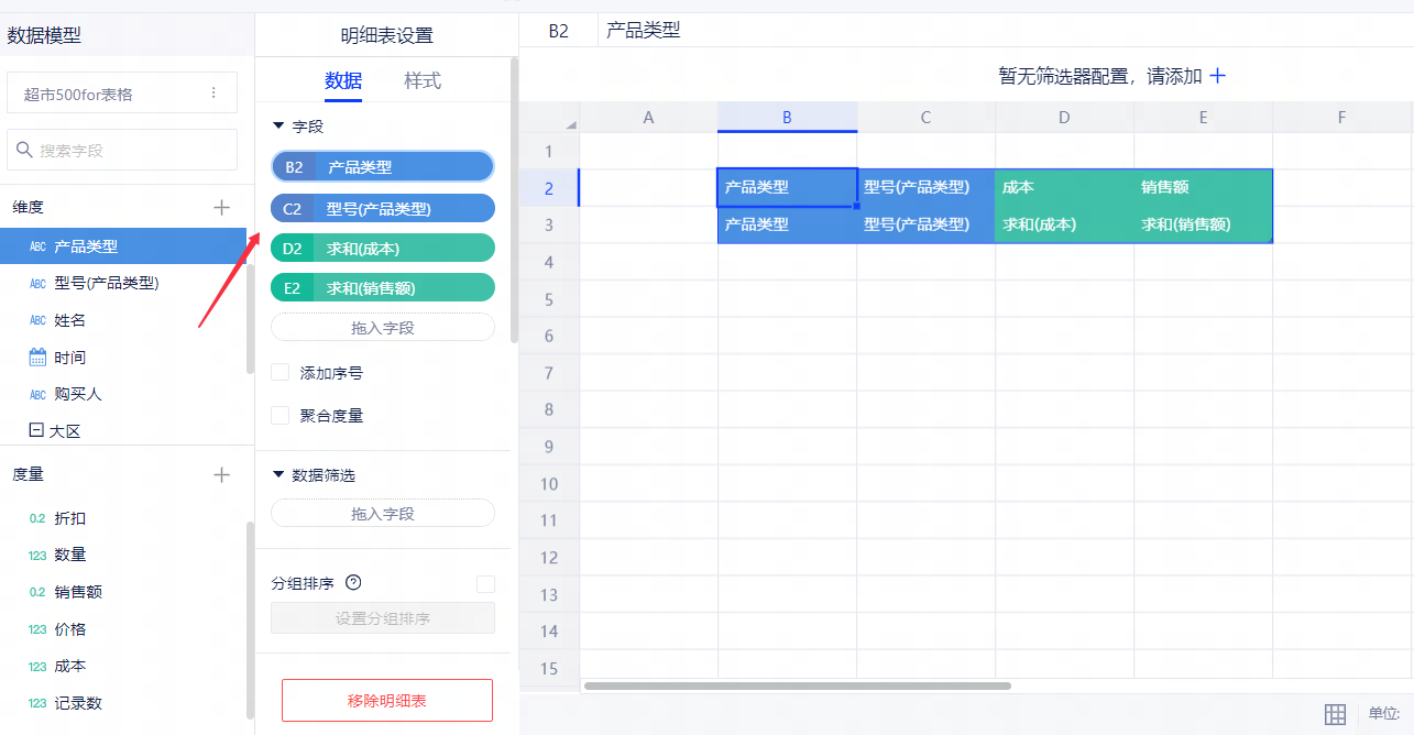 - 操作方式1:将字段拖入当前明细表范围内指定单元格