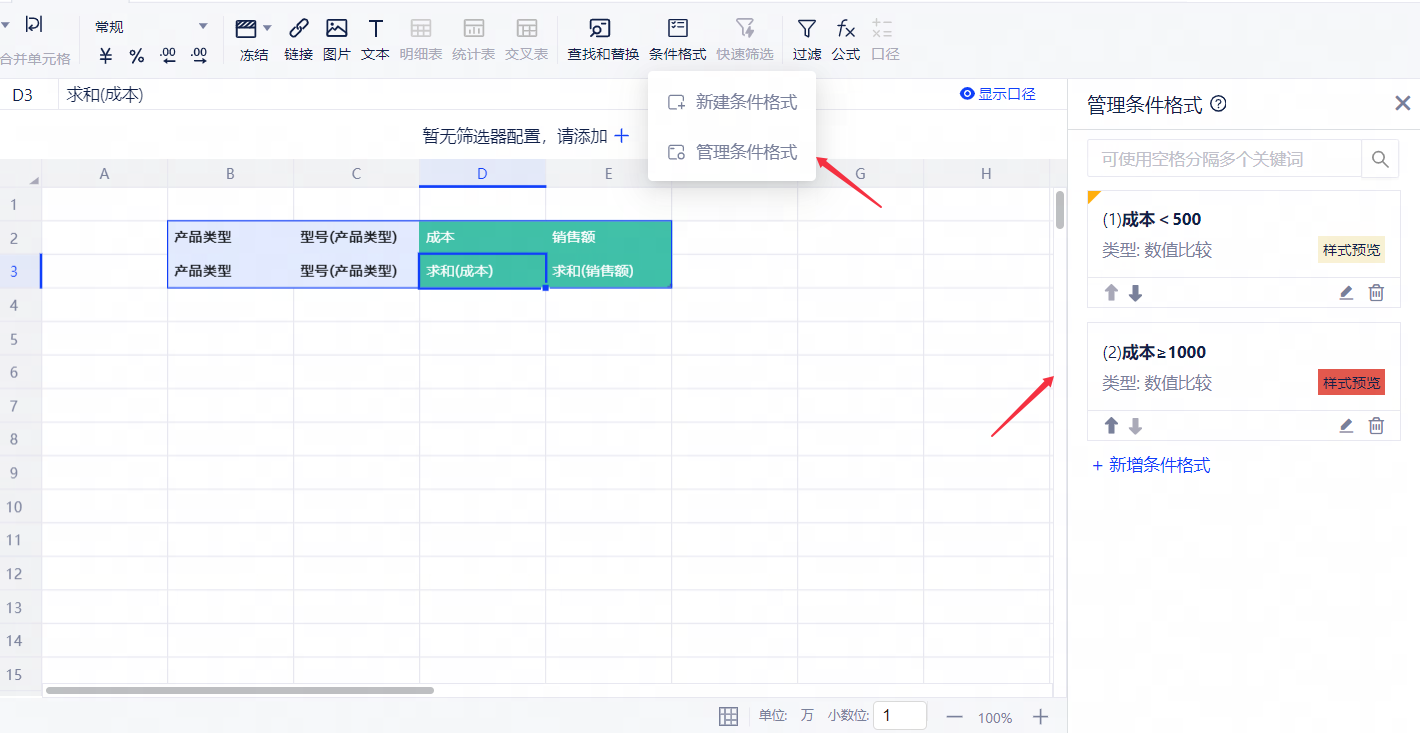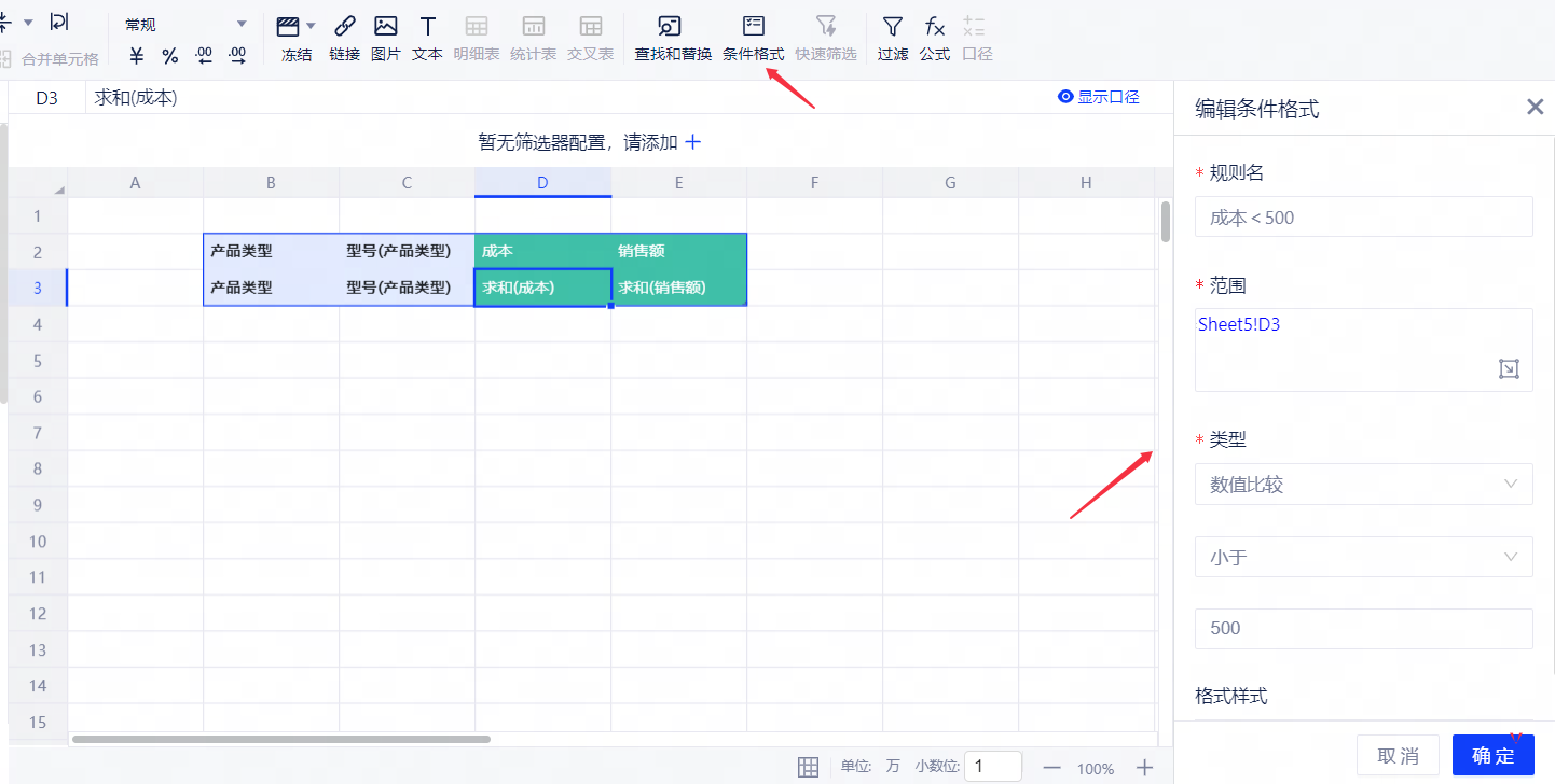 ② 配置条件格式,支持文本、数值、日期、格式判断、自定义公式等条件类型,配置显示的文字样式、单元格样式