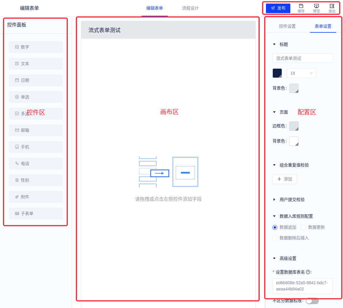 完成创建后便可进入表单的编辑界面,分为左侧控件区、中部画布区和右侧配置区。
