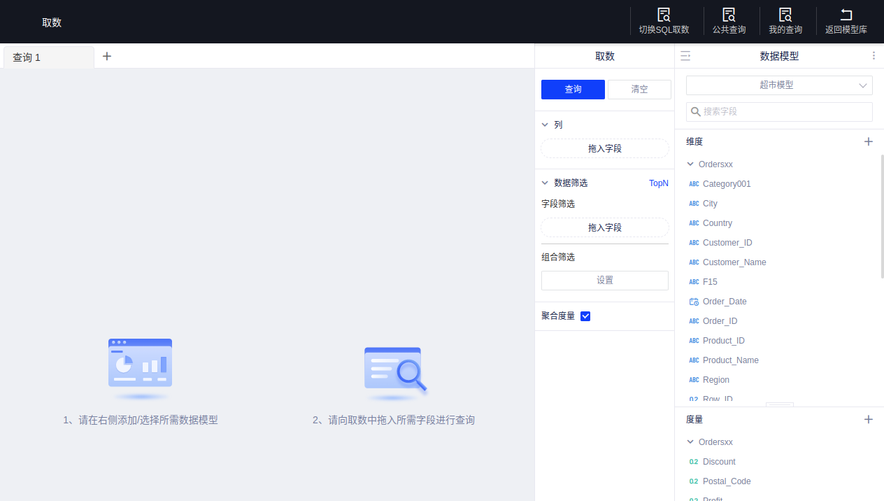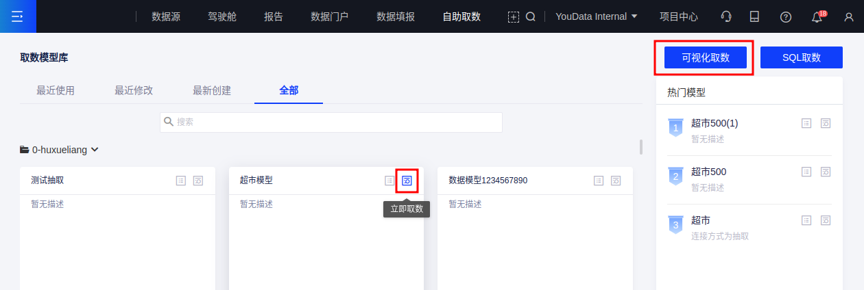 (3)点击首页【立即取数】按钮或模型详情页的【立即取数】按钮,均可快速进入可视化取数模式,详见可视化取数;