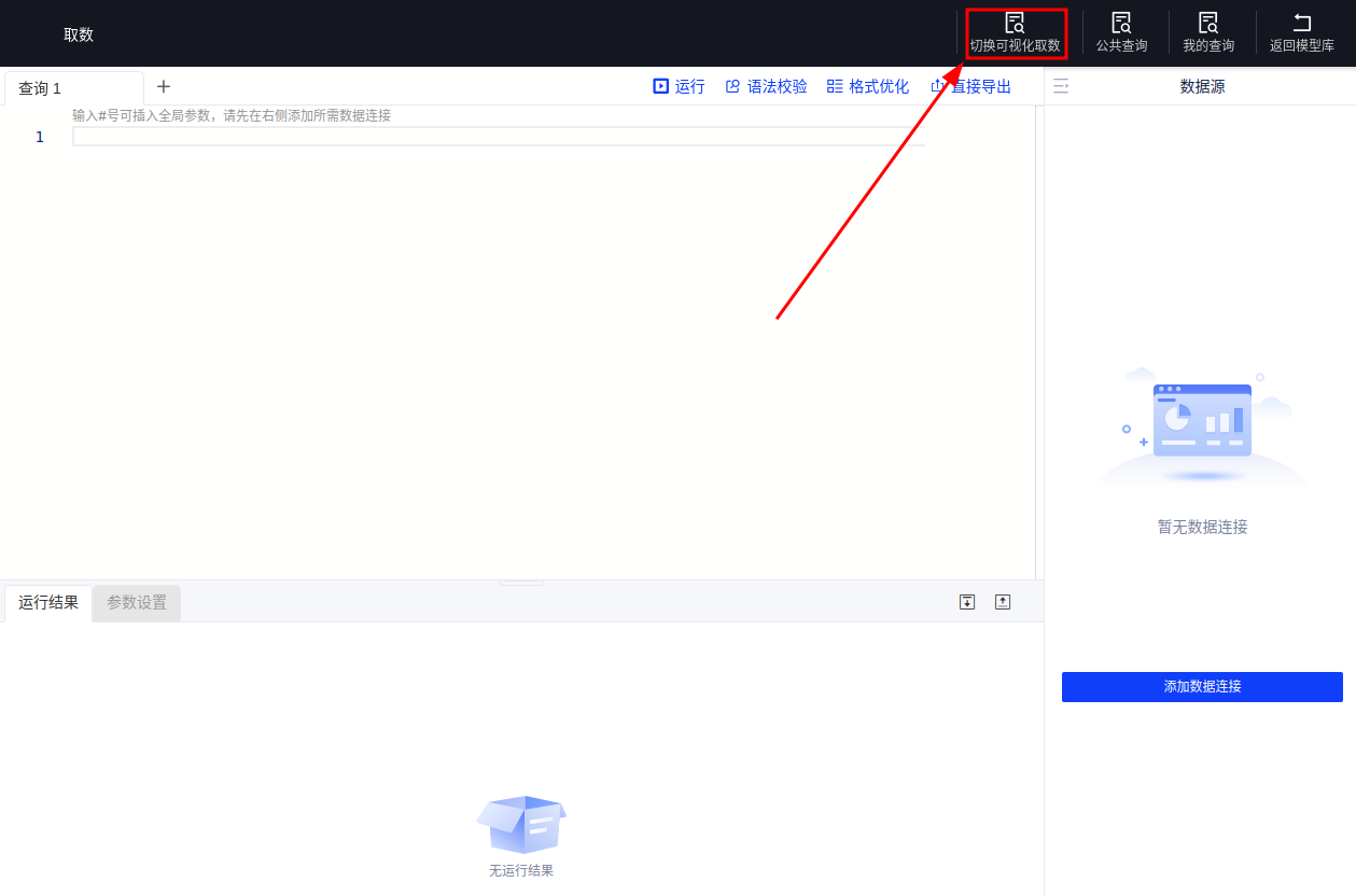 (4)点击首页【SQL取数】按钮,则进入sql取数模式,详见SQL取数,两种查询模式可通过按钮点击切换。